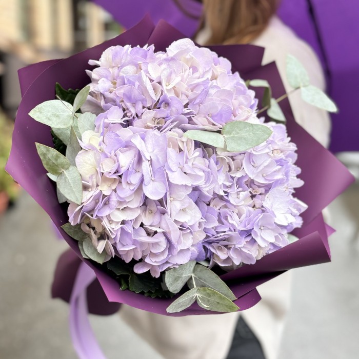Свежий букет из лавандовой гортензии с ароматным эвкалиптом — это утонченное воплощение чистоты и нежности. Три крупных цветка лавандовой гортензии, собранные вместе, создают пышную и воздушную композицию, напоминающую облако. Каждый цветок состоит из множества мелких лепестков, образующих плотные и объемные соцветия.