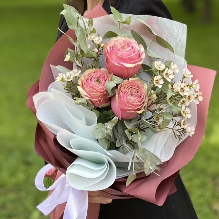 Нежный и ароматный букет из пионовидных роз сорта Белиз с шамелациумом. Пионовидная роза имеет крупный бутон, круглой формы, нежно-розового цвета, с ажурной сердцевиной. Букет упакован в цветную корейскую пленку.