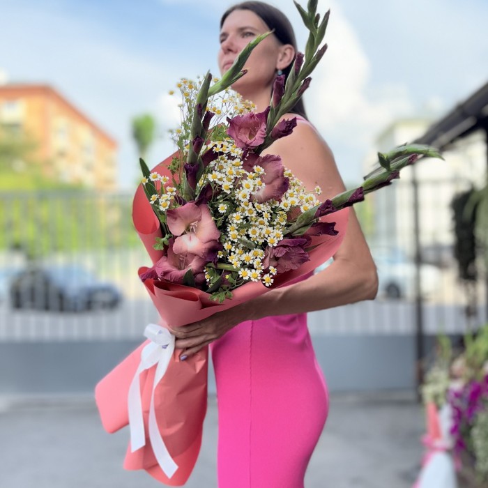 Гладиолусы – самые роскошные осенние цветы, которые не оставят равнодушным никого и смогут порадовать Вашего получателя, а в сочетании с ромашкой этот роскошный букет актуален на любое событие.