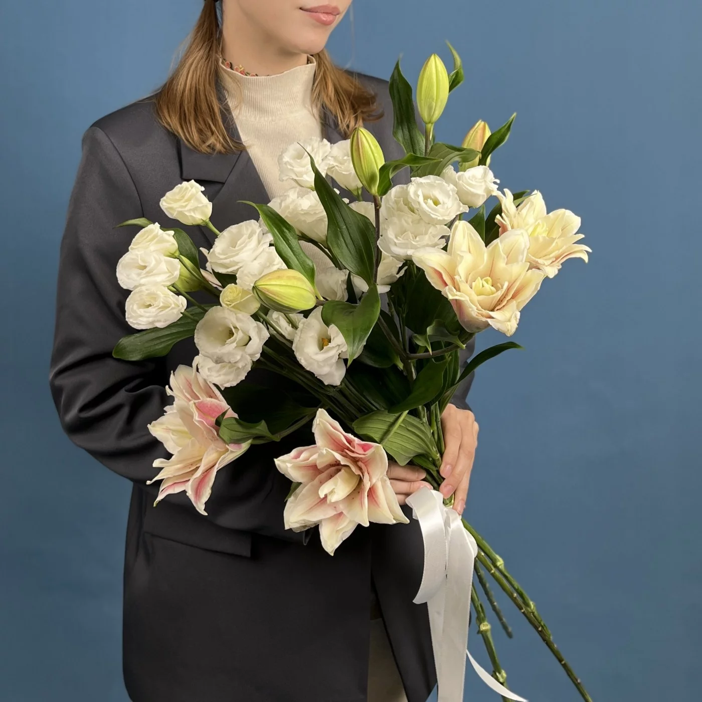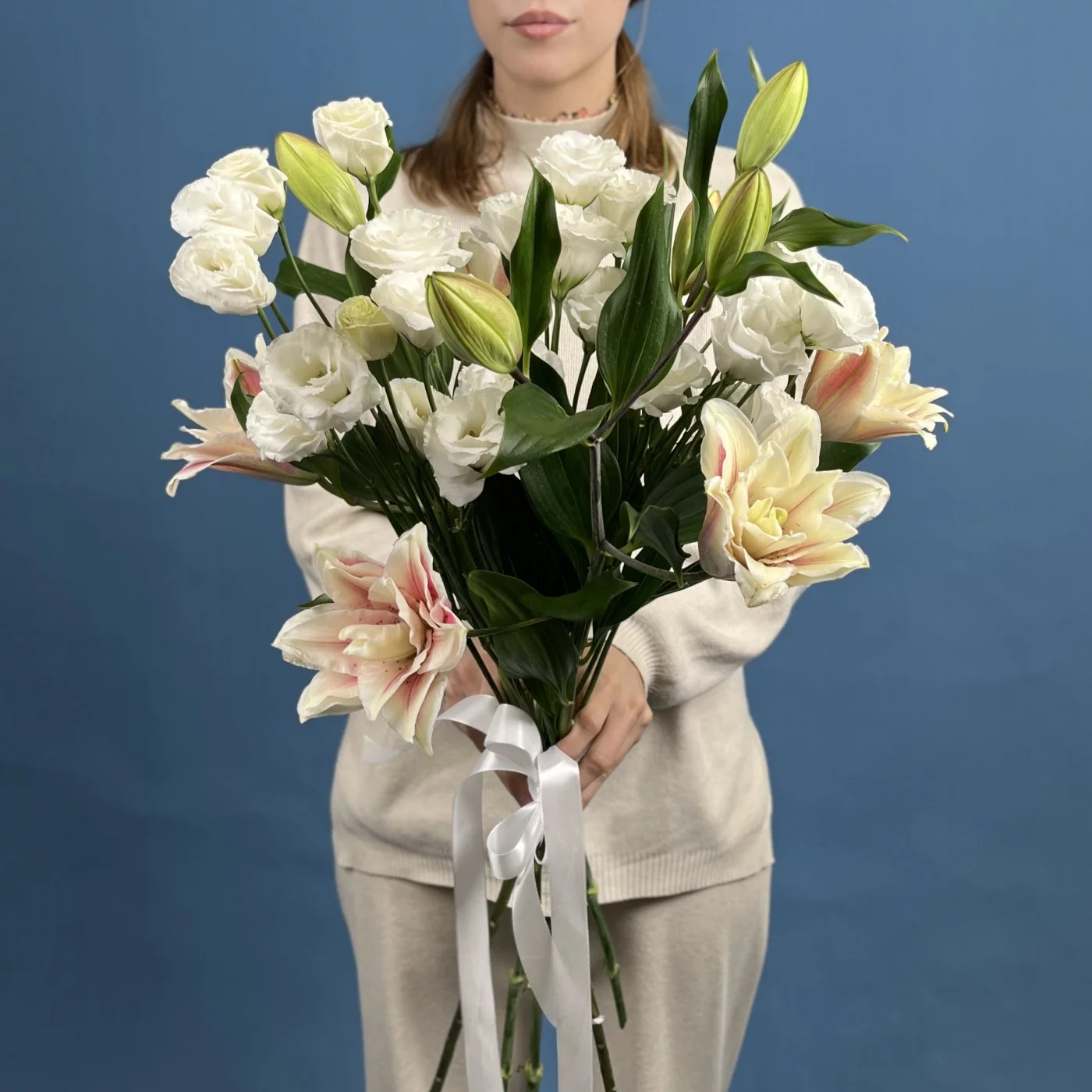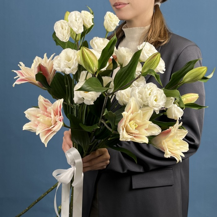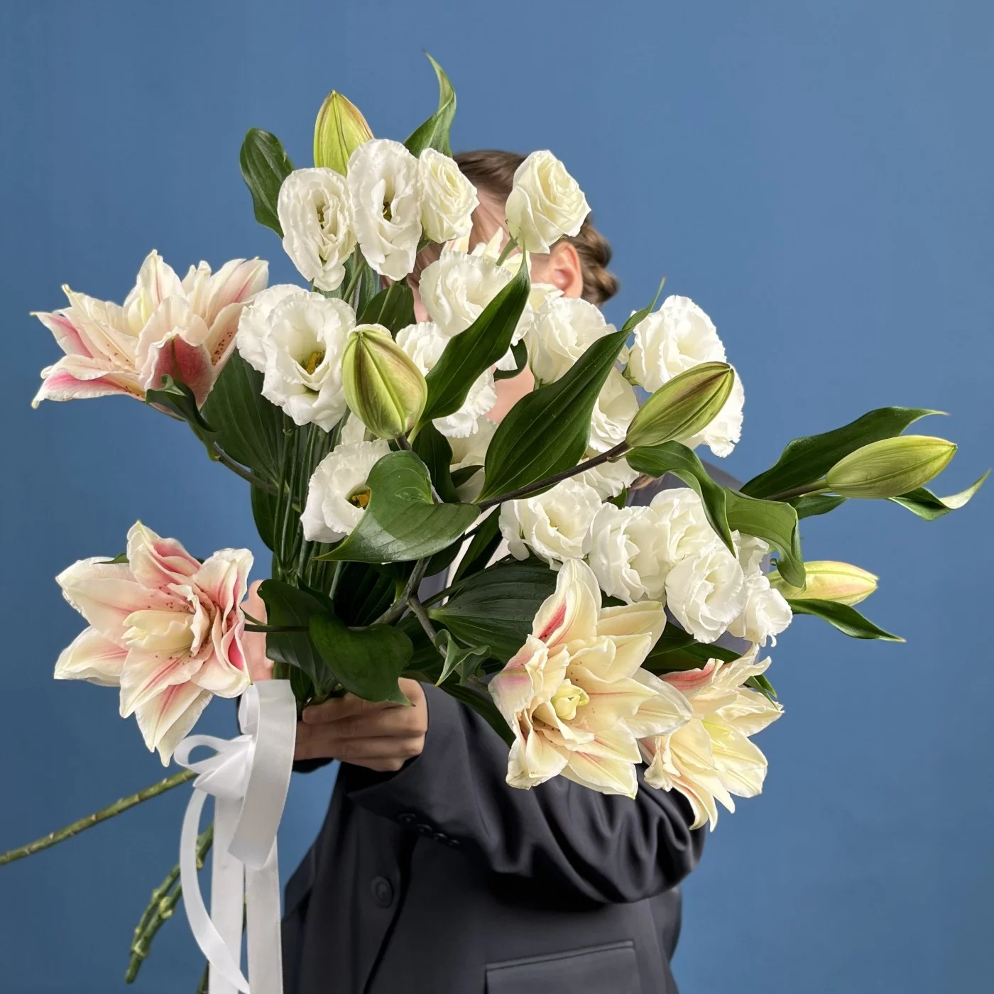 Этот изящный букет состоит из 3 розовых пионовидных лилий, дополненных свежими веточками эвкалипта. Пионовидные лилии поражают своей пышной, многослойной формой, а эустома добавляет эстетики