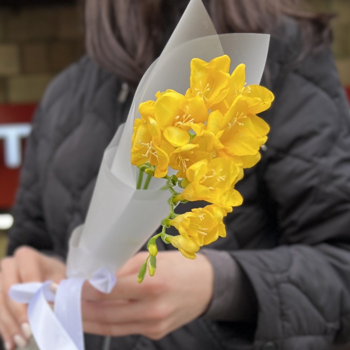3 жёлтые фрезии в упаковке — это яркий и свежий букет, который наполнит пространство солнечным настроением и теплом. Их насыщенный жёлтый цвет символизирует радость, оптимизм и энергию, а изящные цветы с приятным ароматом создают атмосферу уюта и счастья. Такой букет отлично подойдет для подарка, украшения интерьера или чтобы поднять настроение себе и близким. Простая упаковка делает его удобным и стильным подарком для любого случая.