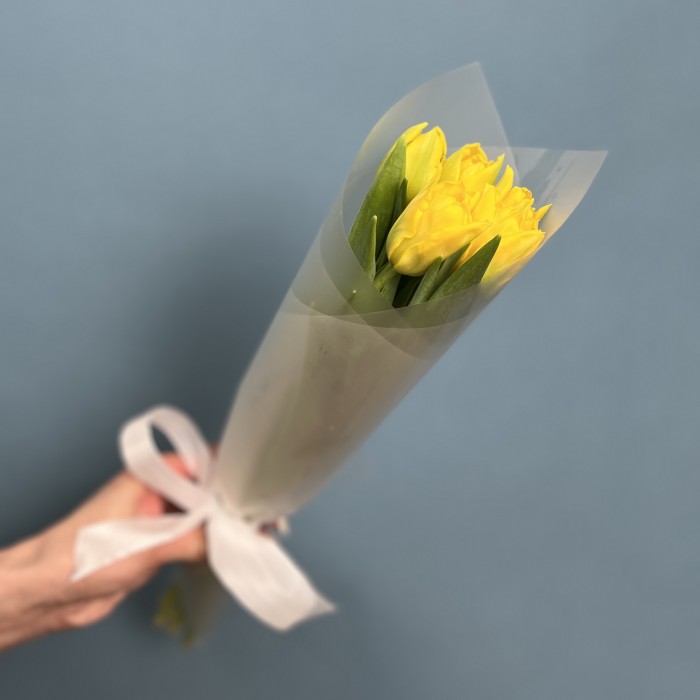 Букет из 5 желтых пионовидных тюльпанов Маргарита — это прекрасный способ выразить свои чувства и создать атмосферу радости и уюта!