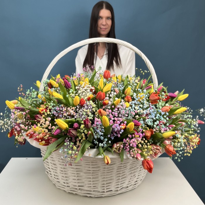 В корзине используются 301 тюльпан различных сортов и цветов, что создает эффектный визуальный акцент. Яркие и насыщенные оттенки тюльпанов в сочетании с нежными пастельными тонами наполняют пространство весенним настроением. Радужная гипсофила добавляет легкости и воздушности, создавая романтичный и игривый вид.
