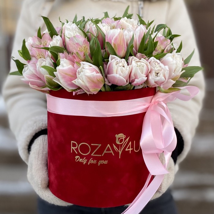Весенний букет из 31 бело-розового тюльпана с альстромерией в фирменной бархатной коробочке. Нежная композиция в яркой коробке подарит хорошее настроение и приятные воспоминания о Вас.