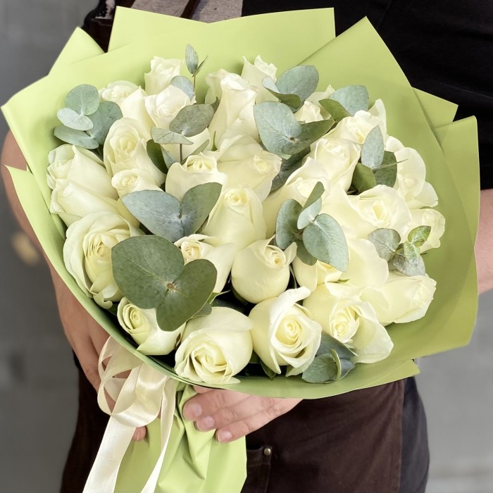 Букет из 31 длинной белой розы (60 см) с эвкалиптом — это великолепная композиция, которая излучает элегантность и утонченность. Этот букет отлично подойдет для различных торжественных случаев, таких как свадьбы, юбилеи, дни рождения или просто как символ особого внимания к близким.