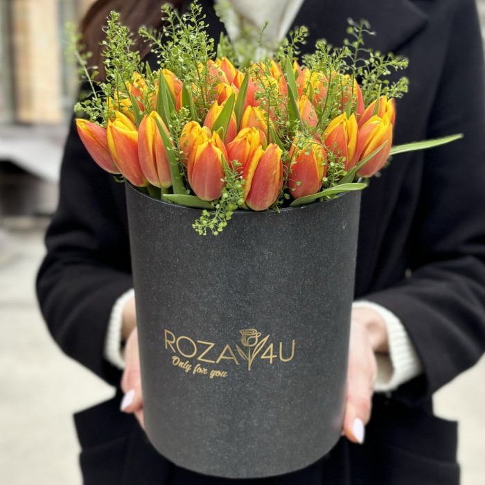 Коробка с 35 тюльпанами сорта Денмарк в стильной коробке. Отличный презент на мартовские праздники и отличное напоминание о том что весна уже началась!