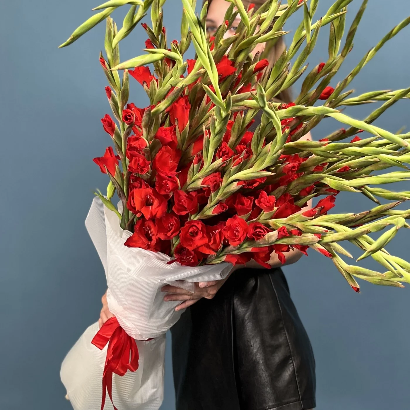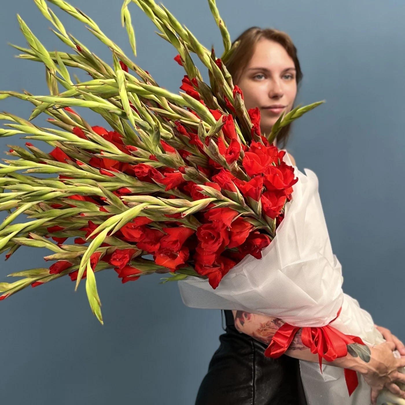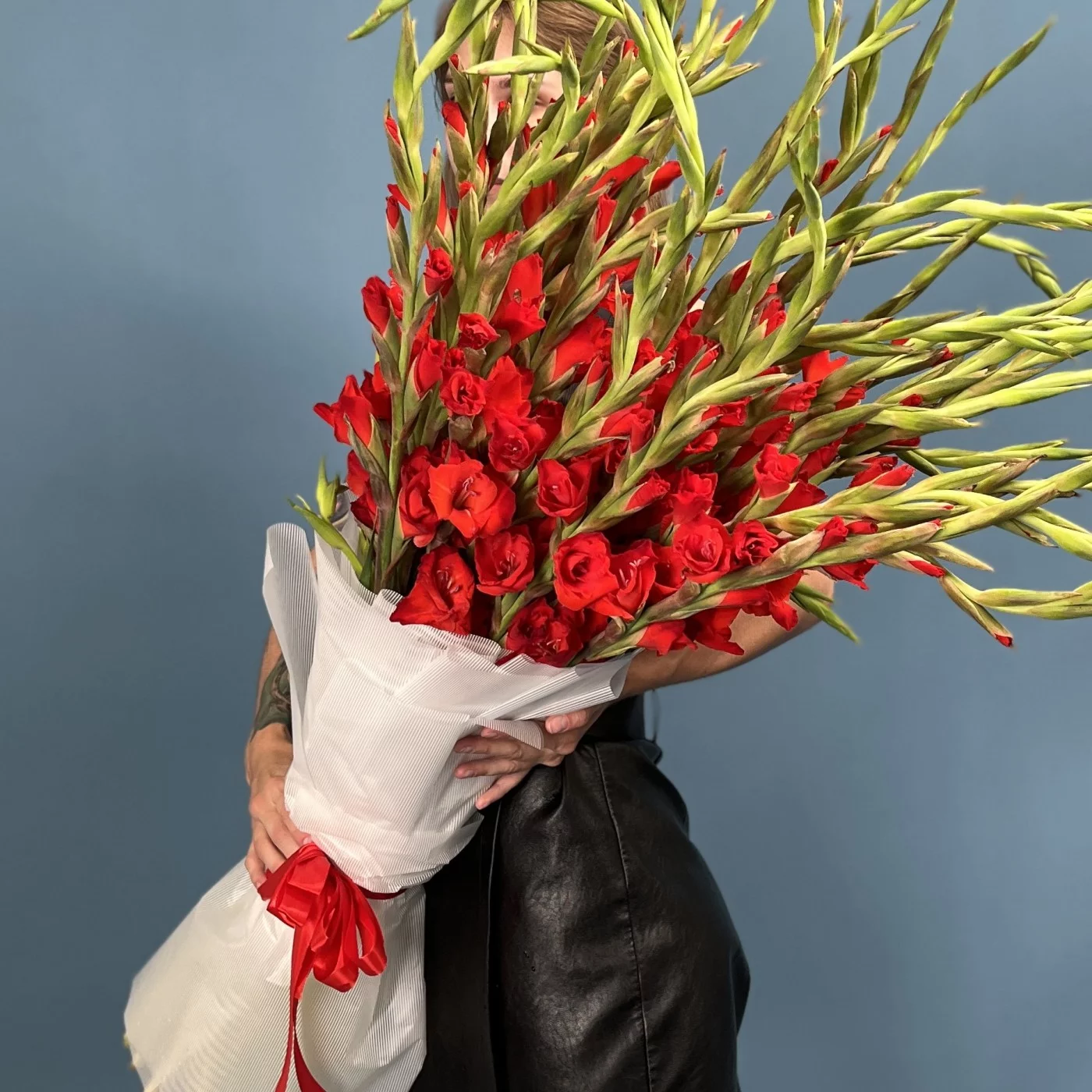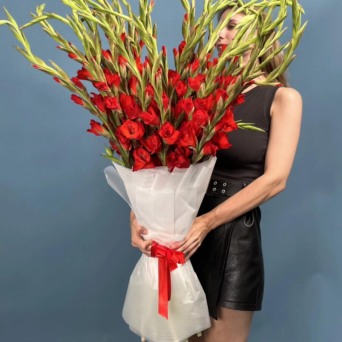 Элегантный букет из 35 красных гладиолусов — это яркое выражение страсти и силы.