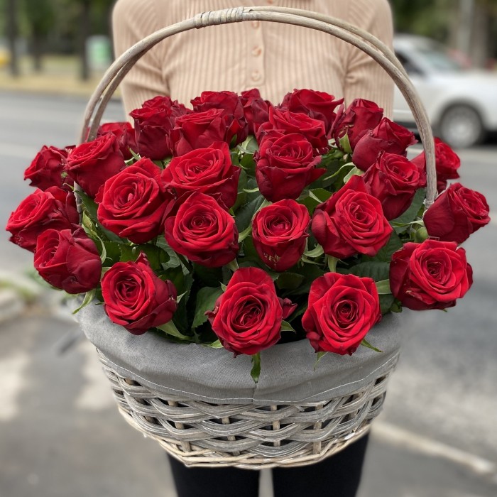 35 красных роз сорта «Ред Наоми» в корзине — это великолепное цветочное оформление, которое подходит для различных торжеств, особенно для романтических событий.