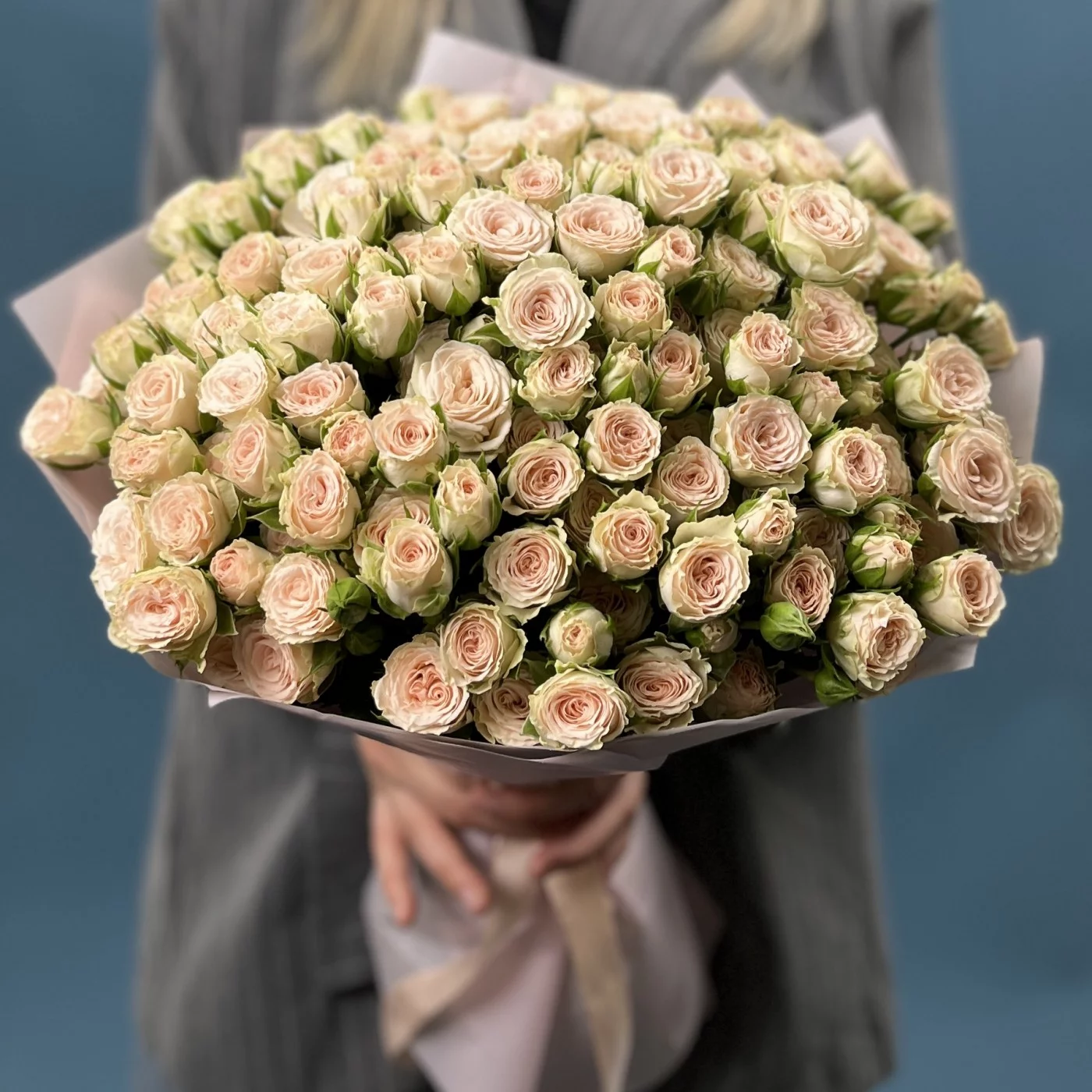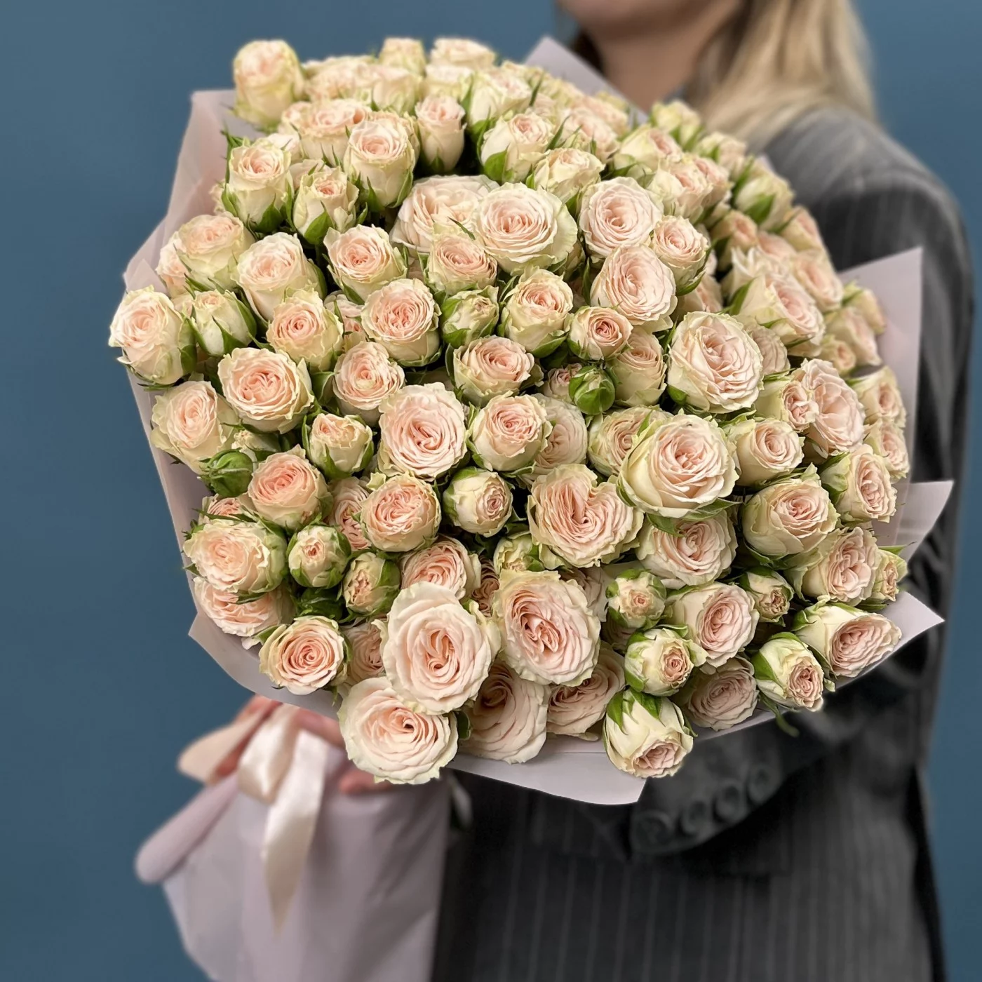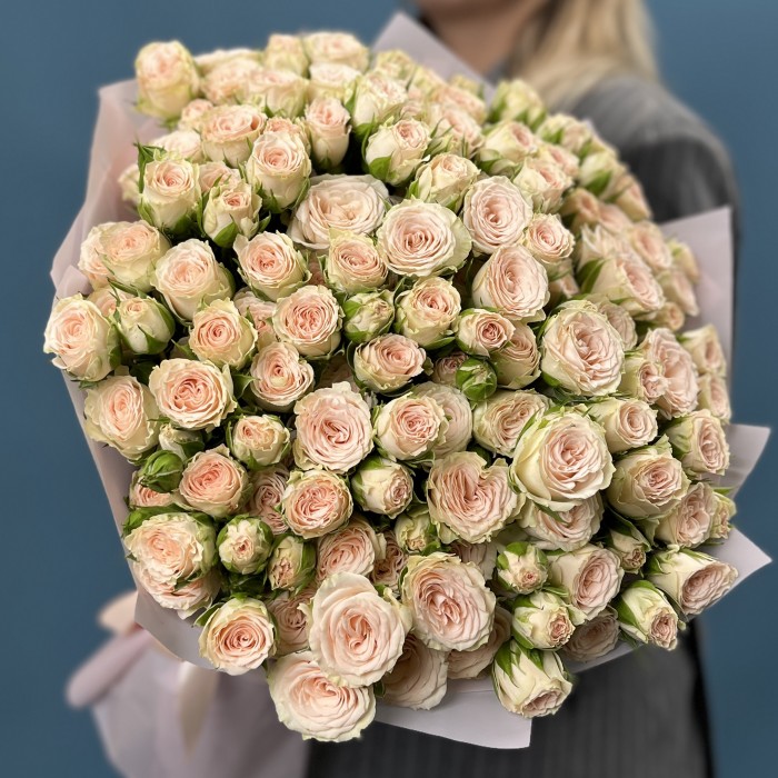 35 кустовых роз Рослин 50 см — настоящий праздник цвета и формы. Каждый полумахровый бутон раскрывается нежными, плотными лепестками, создавая пышную и насыщенную композицию, которая поражает своей выразительностью и гармонией.