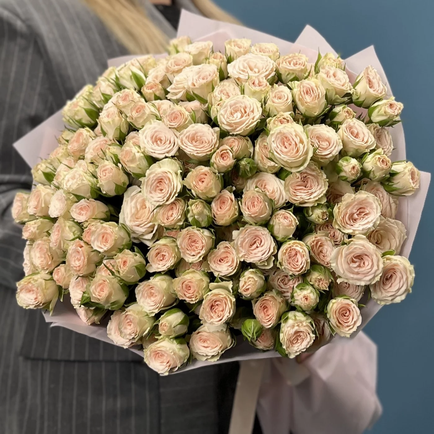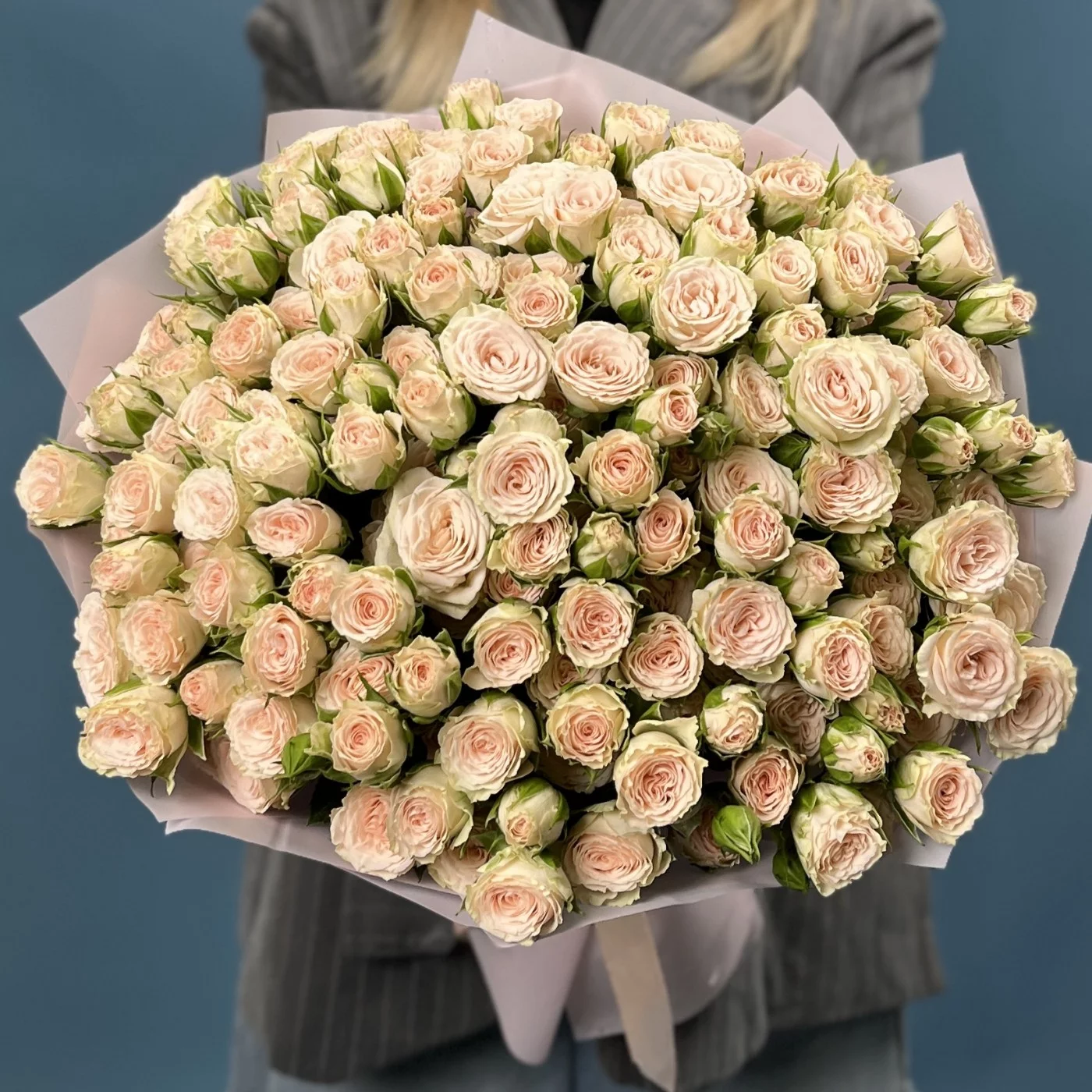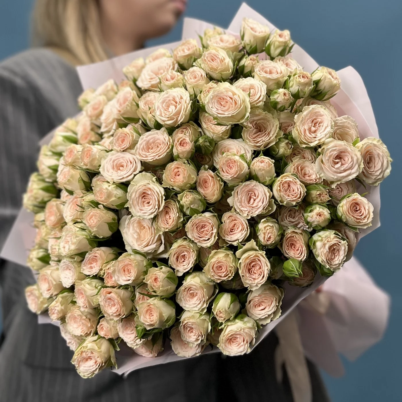35 кустовых роз Рослин 50 см — настоящий праздник цвета и формы. Каждый полумахровый бутон раскрывается нежными, плотными лепестками, создавая пышную и насыщенную композицию, которая поражает своей выразительностью и гармонией.