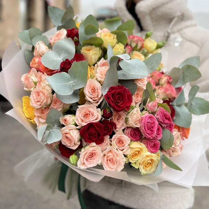 Состав и сорт цветов могут отличатся от фото, цветовая гамма композиции будет сохранена.