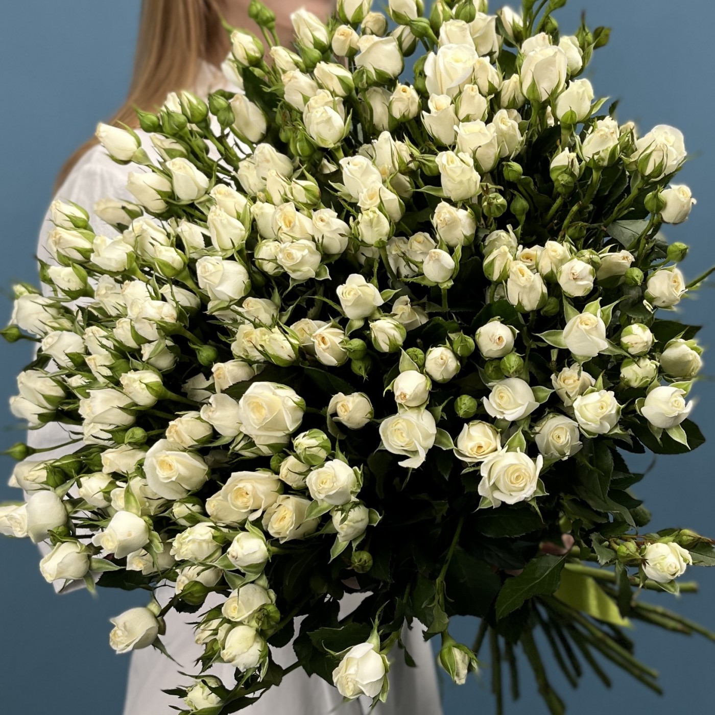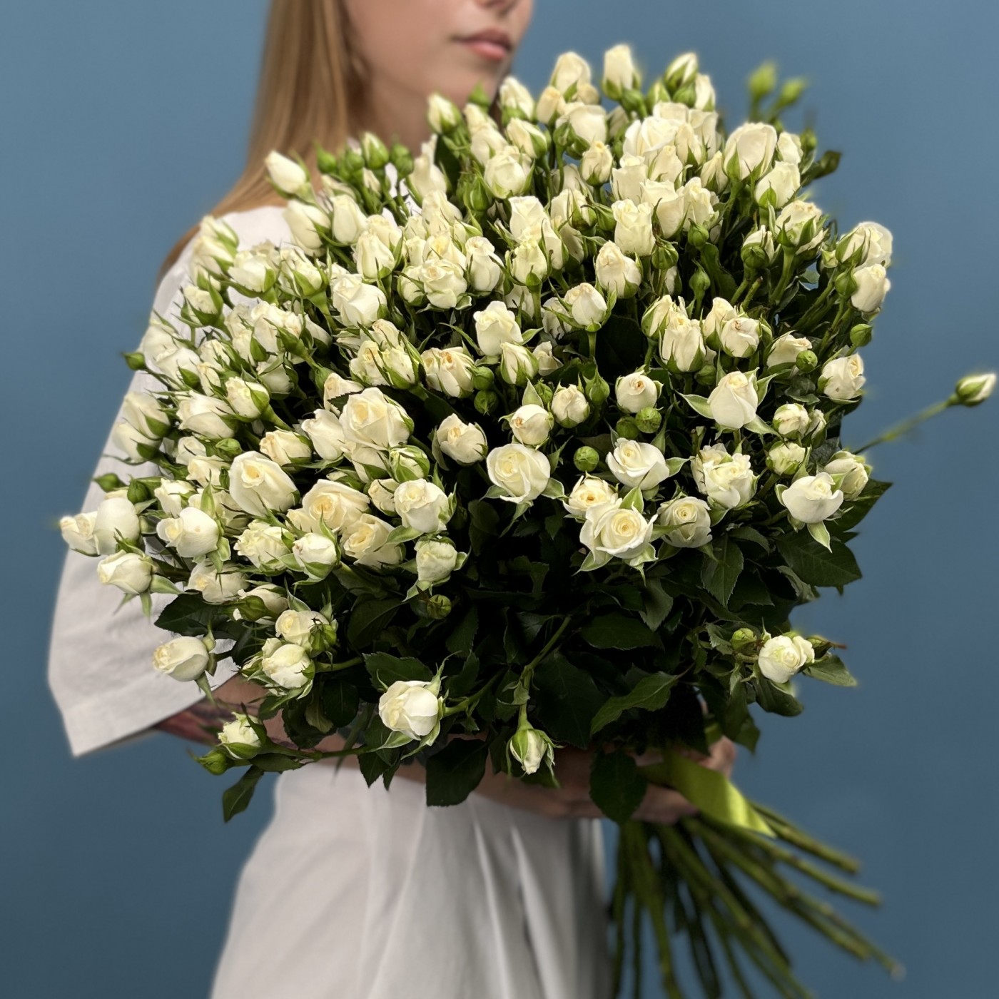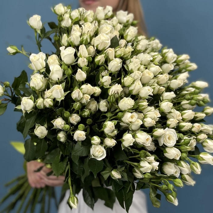 35 кустовых роз сорта Сноу Бабл высотой 70 см — это впечатляющее сочетание величия и утончённой красоты. Высокие крепкие стебли поддерживают пышные белоснежные бутоны, создавая эффект воздушной и роскошной композиции.