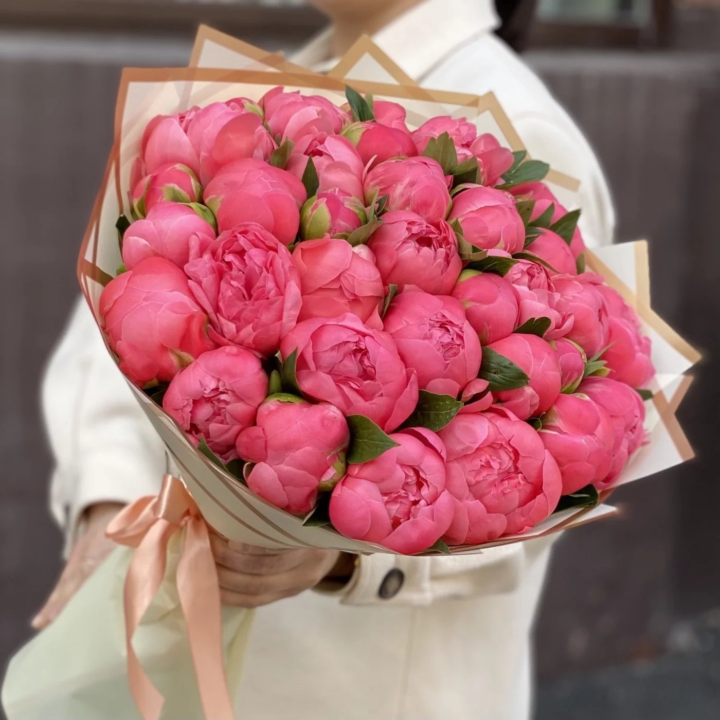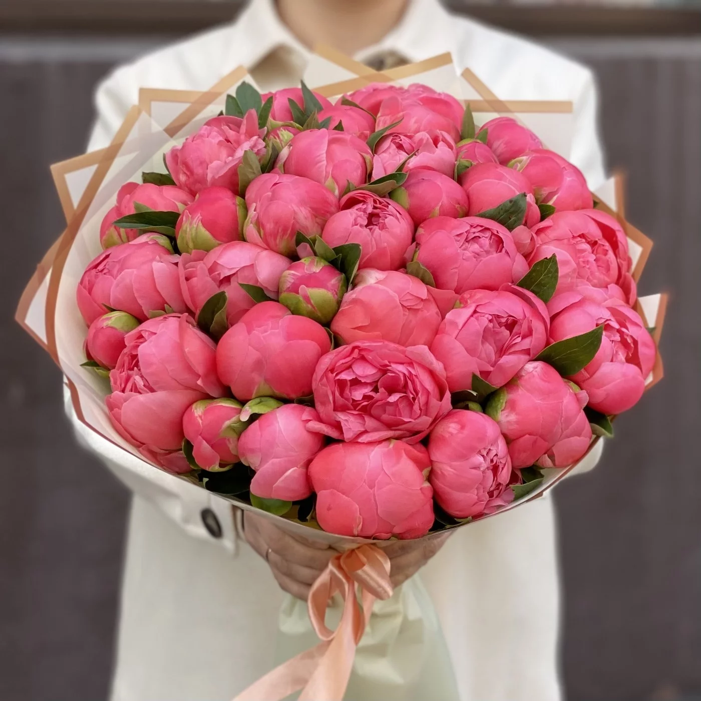 Прекрасный букет из 35 ярких коралловых пионов с очень интересным раскрытием бутона.