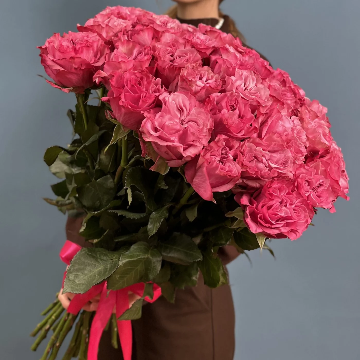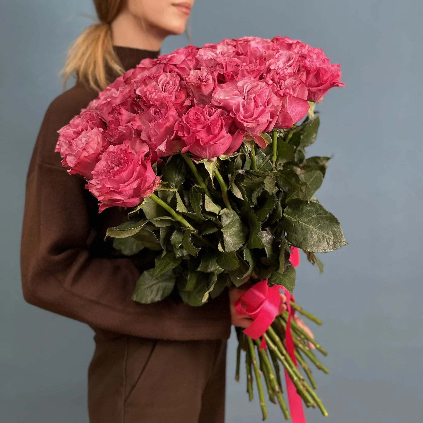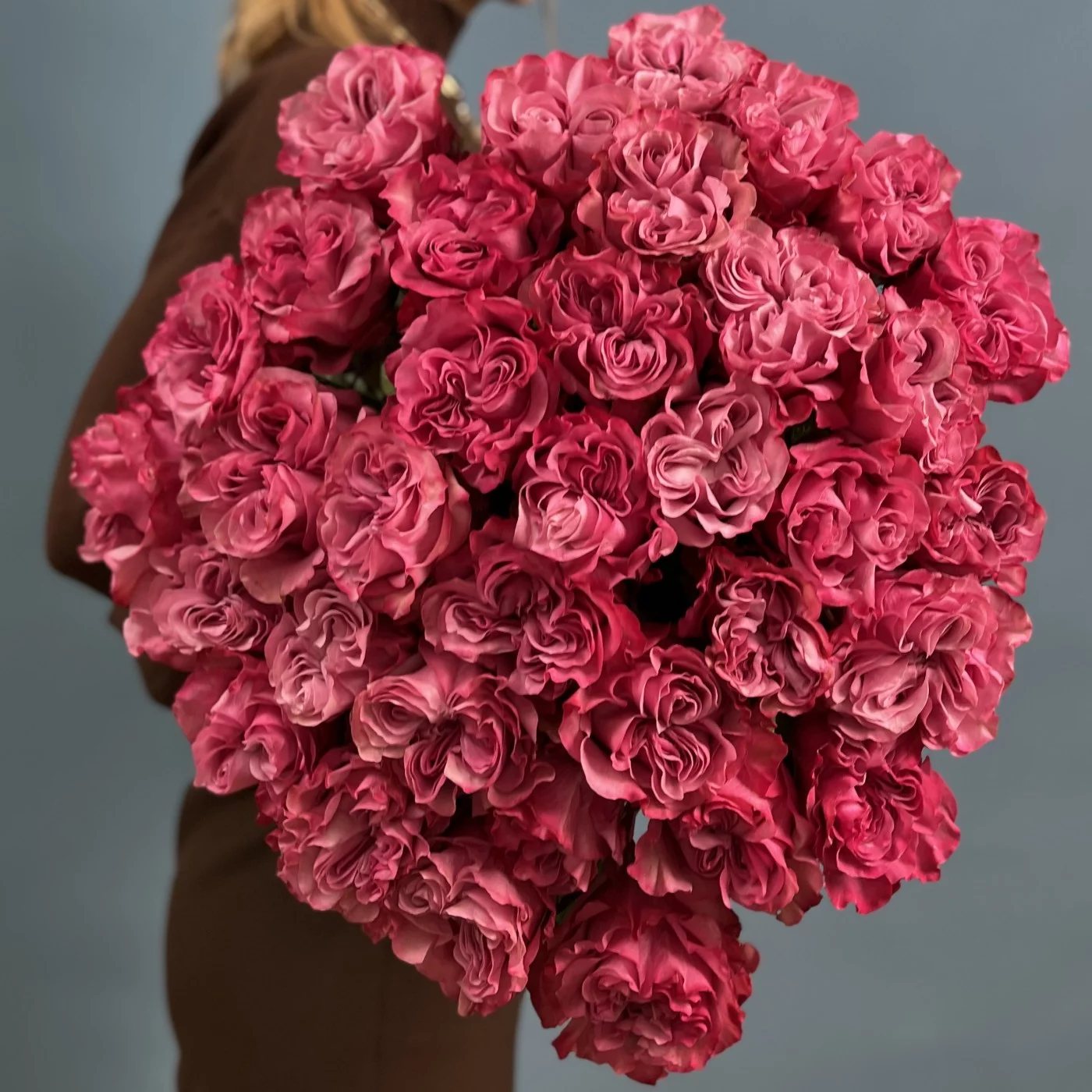 Букет из 35 пионовидных роз сорта Кантри Блюз длиной 60 см — это поистине роскошный и впечатляющий подарок, который станет настоящим акцентом на любом мероприятии.