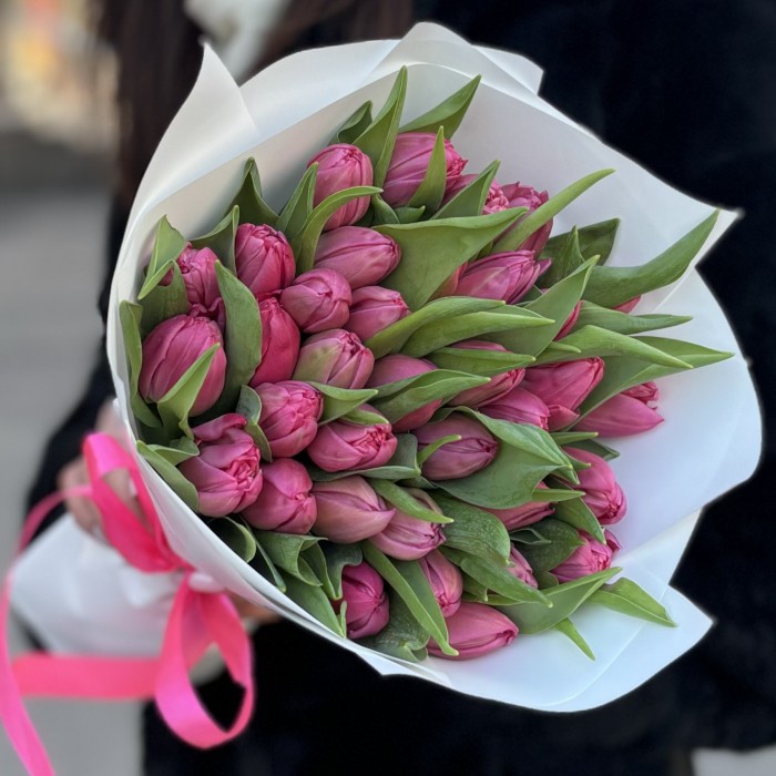 Букет из пионовидных розовых тюльпанов в цветной матовой упаковке перевязанный яркой атласной лентой.