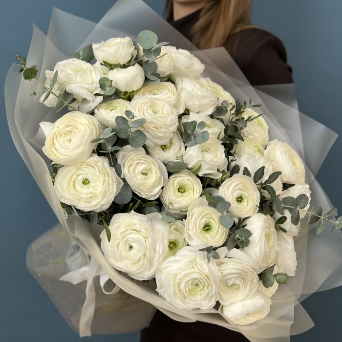 Букет из 35 пышных белых ранункулюсов с эвкалиптом — это не просто цветы, а настоящее выражение любви и заботы. Он станет ярким акцентом на любом мероприятии и порадует каждого, кто получит этот прекрасный подарок. Поделитесь красотой и нежностью этого букета с теми, кого вы любите!