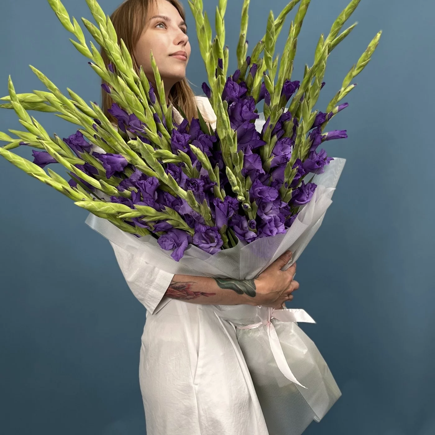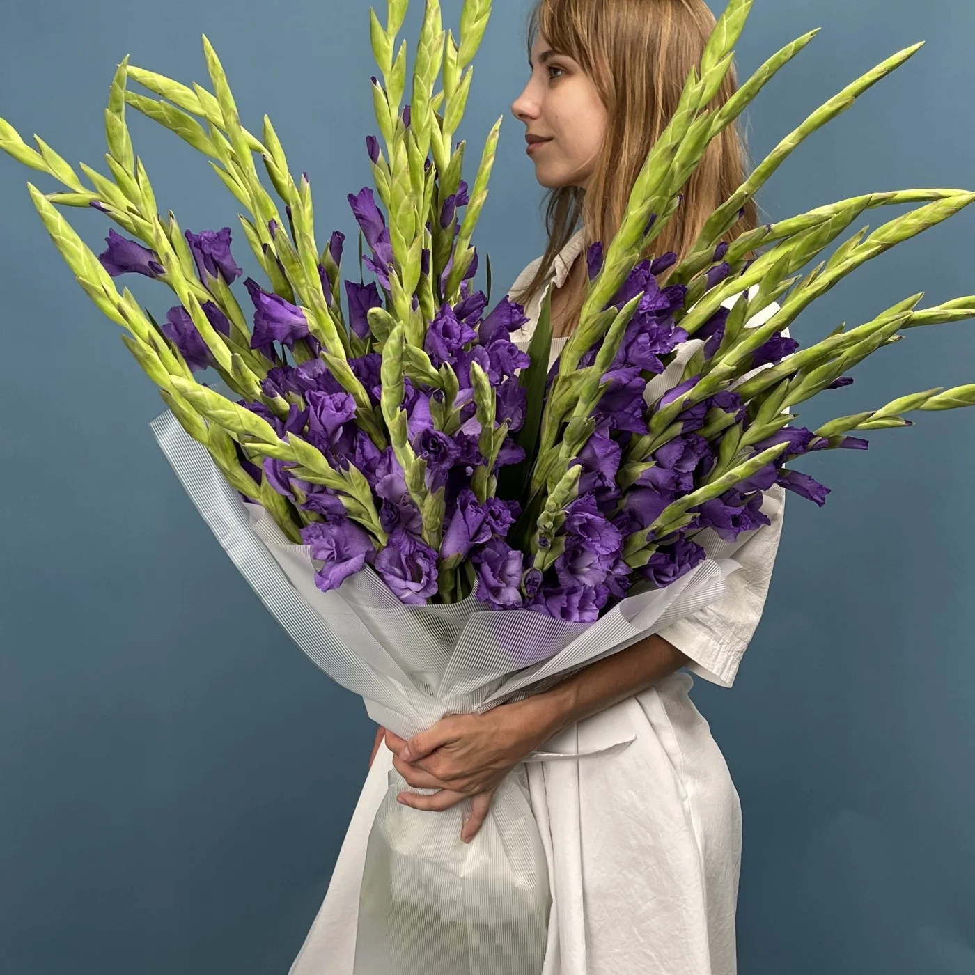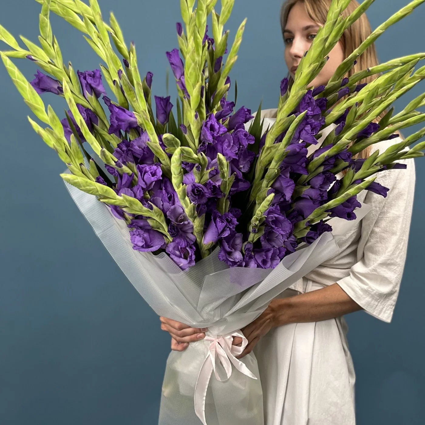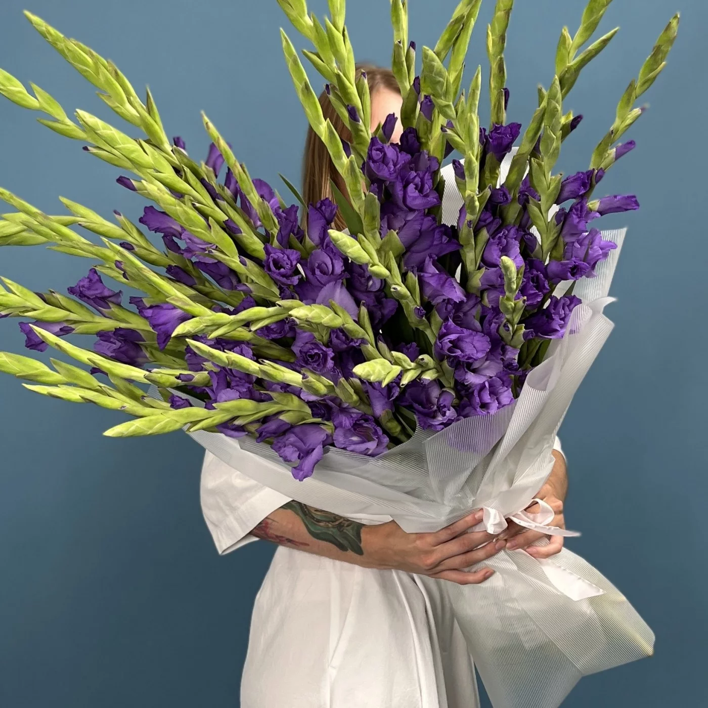 35 темно-фиолетовых гладиолусов — это выразительный и эффектный букет, который поражает своей глубиной цвета и стройной, величественной формой цветов.