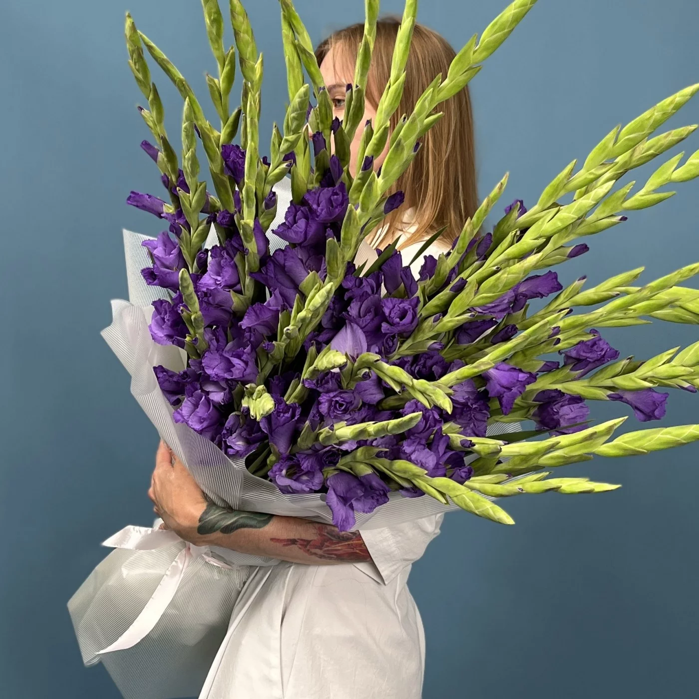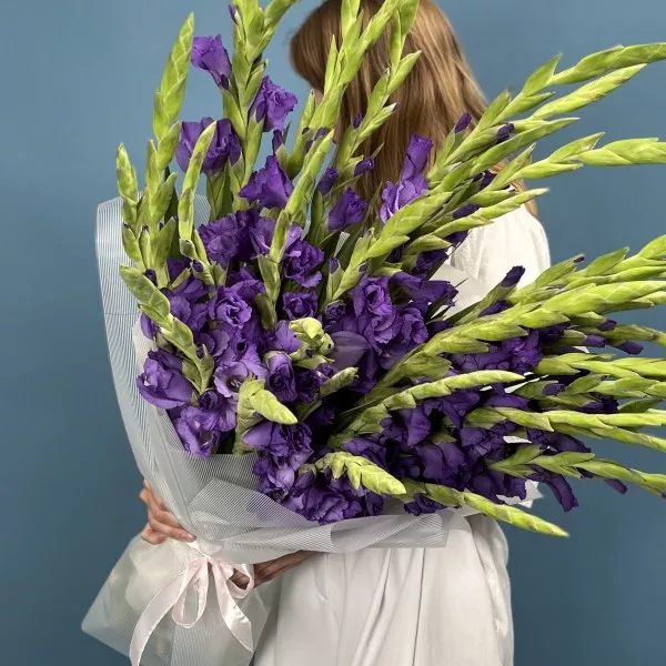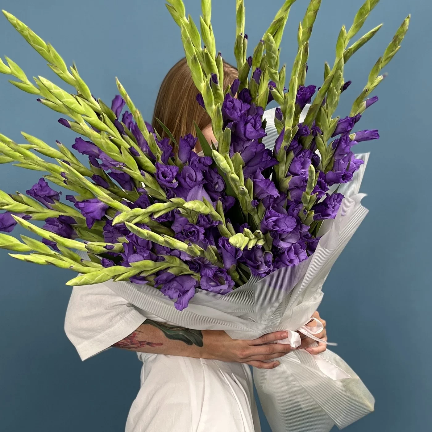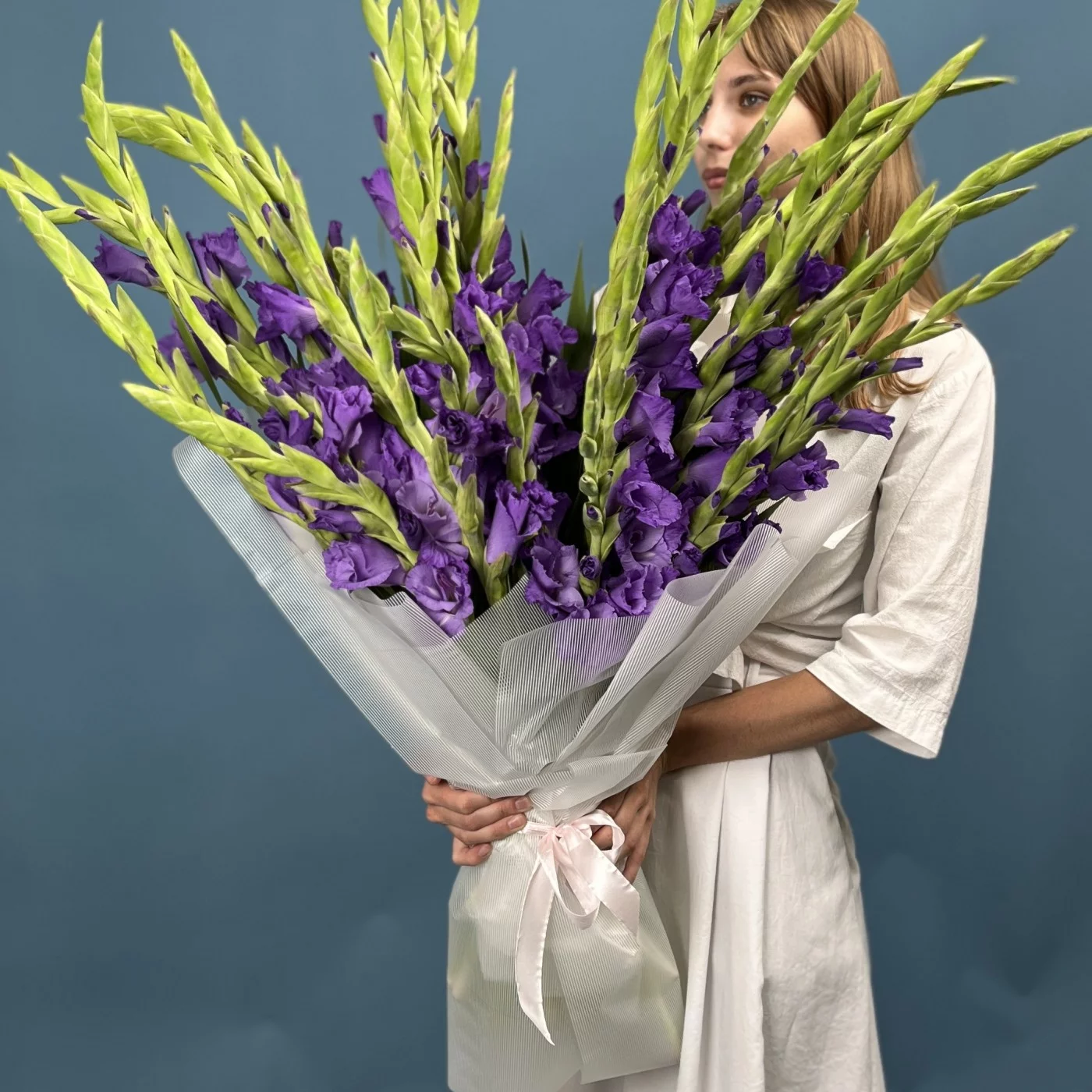 35 темно-фиолетовых гладиолусов — это выразительный и эффектный букет, который поражает своей глубиной цвета и стройной, величественной формой цветов.