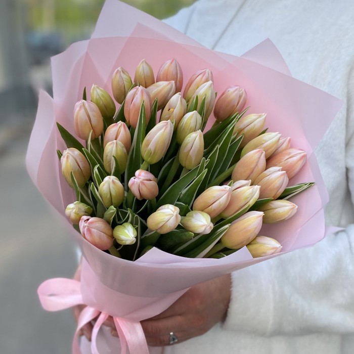 Букет из 35 тюльпанов сорта Марк Дизайн — это воплощение нежности и весенней свежести. Эти тюльпаны, с их изысканным сочетанием бело-розовых оттенков, создают великолепную и гармоничную композицию. Крупные, бархатистые лепестки каждого цветка и упругие стебли обеспечивают букету длительное сохранение свежести и привлекательности.