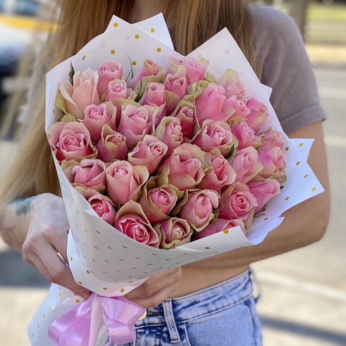 35 розово-зеленых роз создает эффект яркого и свежего букета, который привлекает внимание и дарит настроение. Каждая роза обладает гармоничным сочетанием нежного розового и мягкого зеленого оттенков, что придает композицией романтичность и оригинальность.