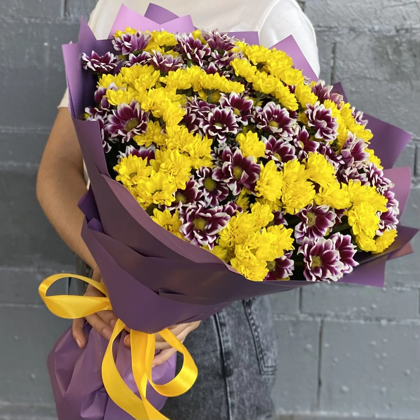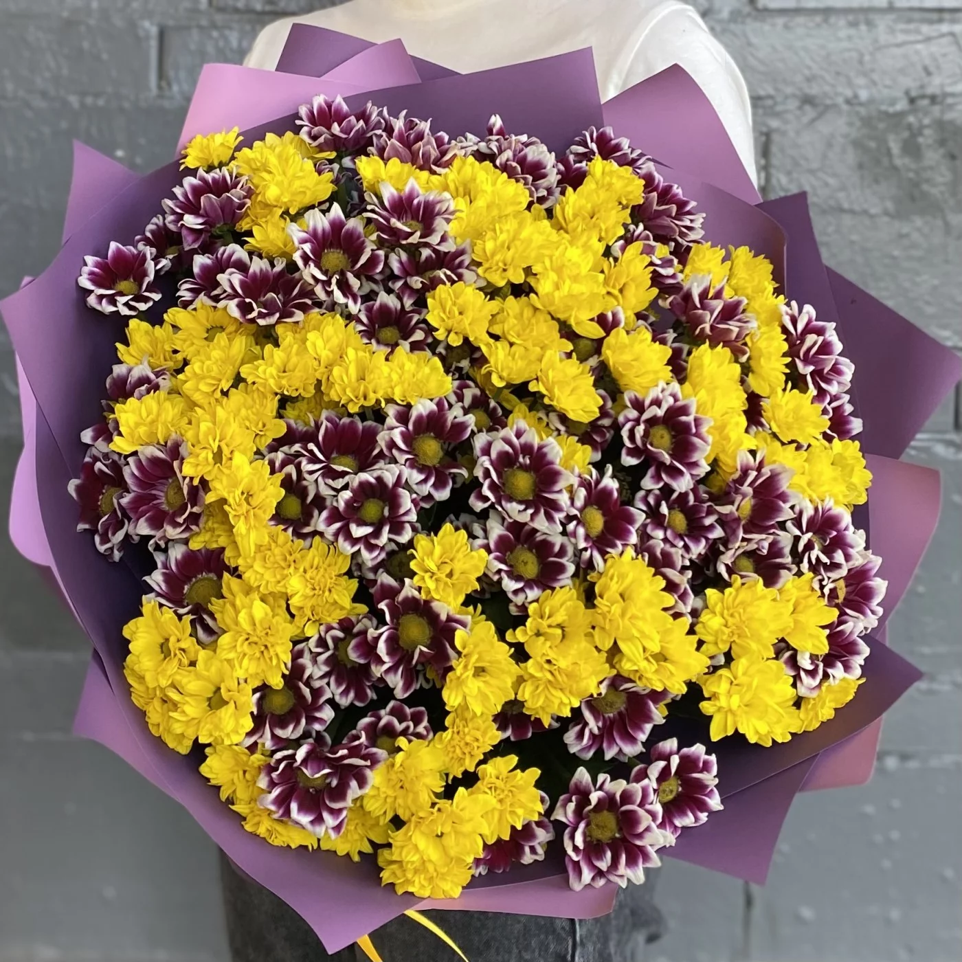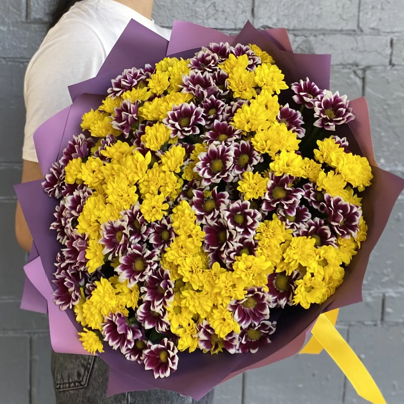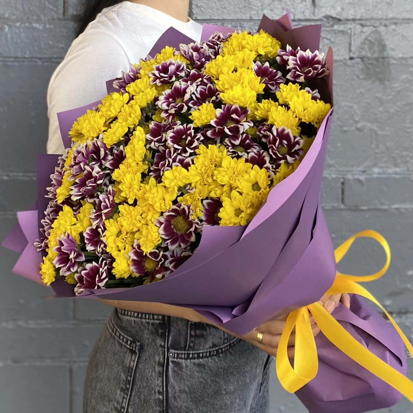 Яркий букет из 35 фиолетовых и желтых хризантем Сантини обязательно порадует свою получательницу и подарит ей улыбку на весь день!