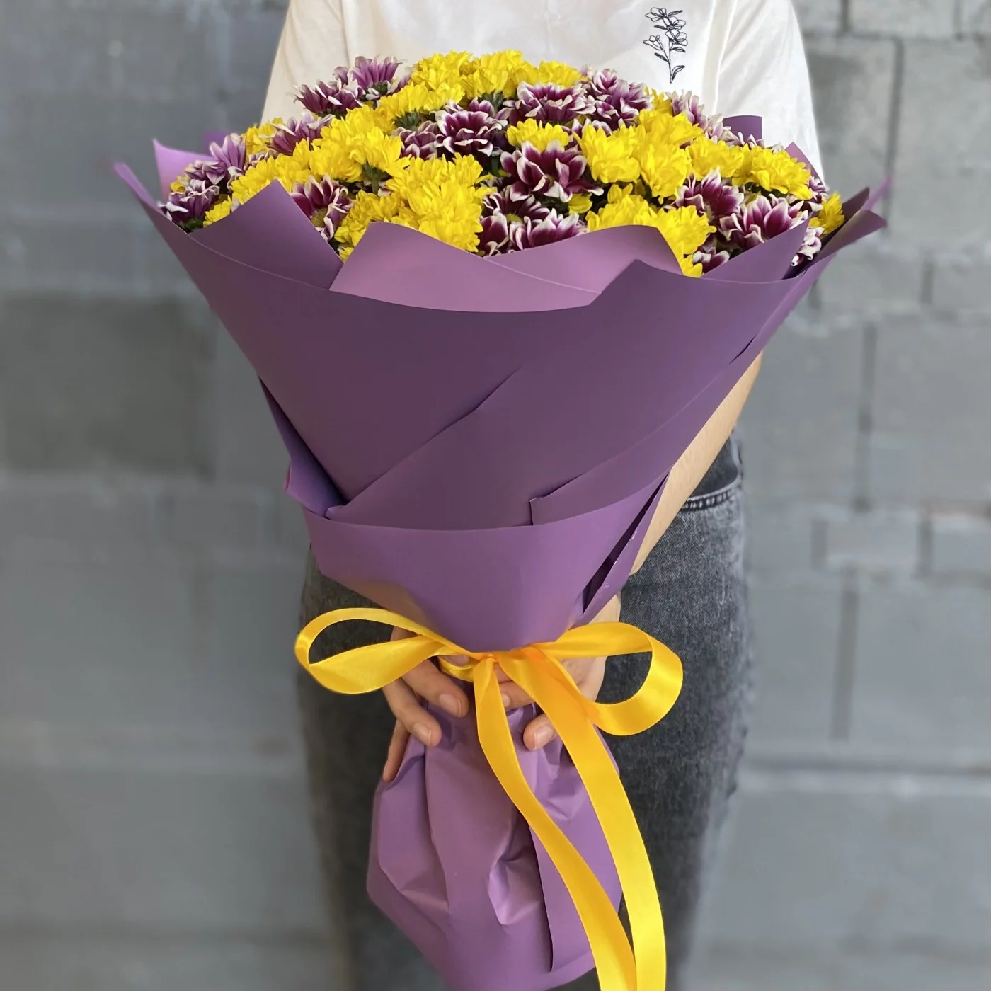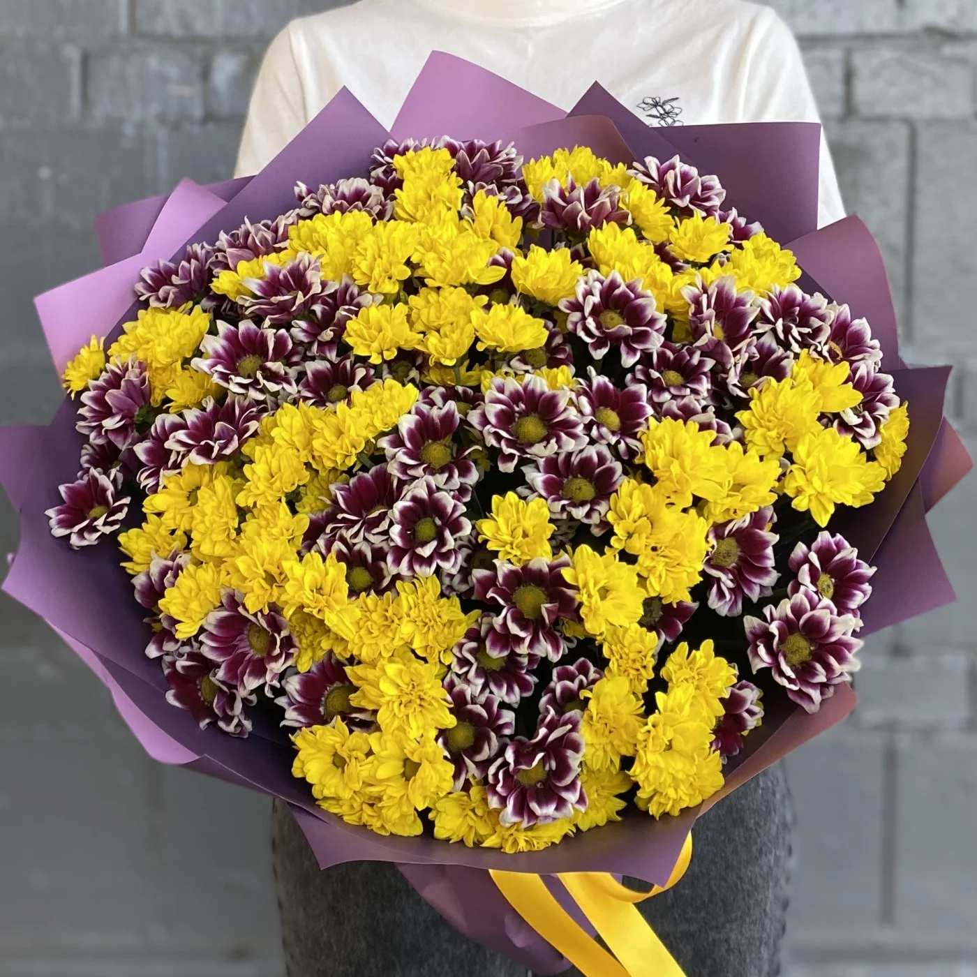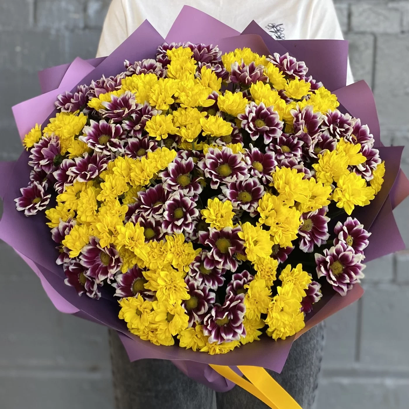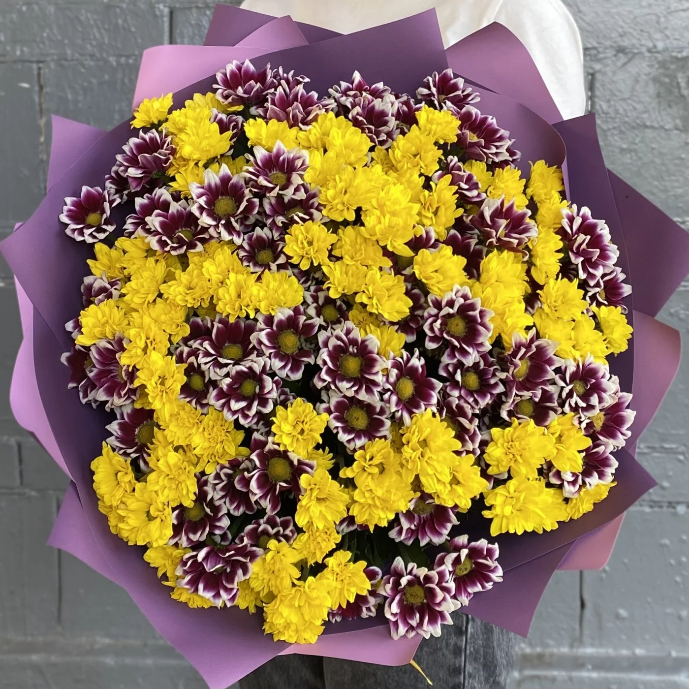 Яркий букет из 35 фиолетовых и желтых хризантем Сантини обязательно порадует свою получательницу и подарит ей улыбку на весь день!