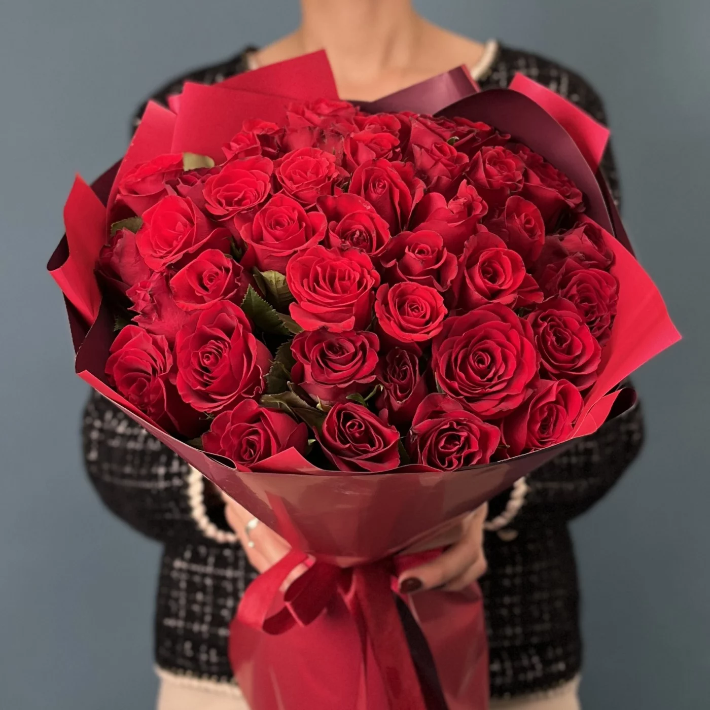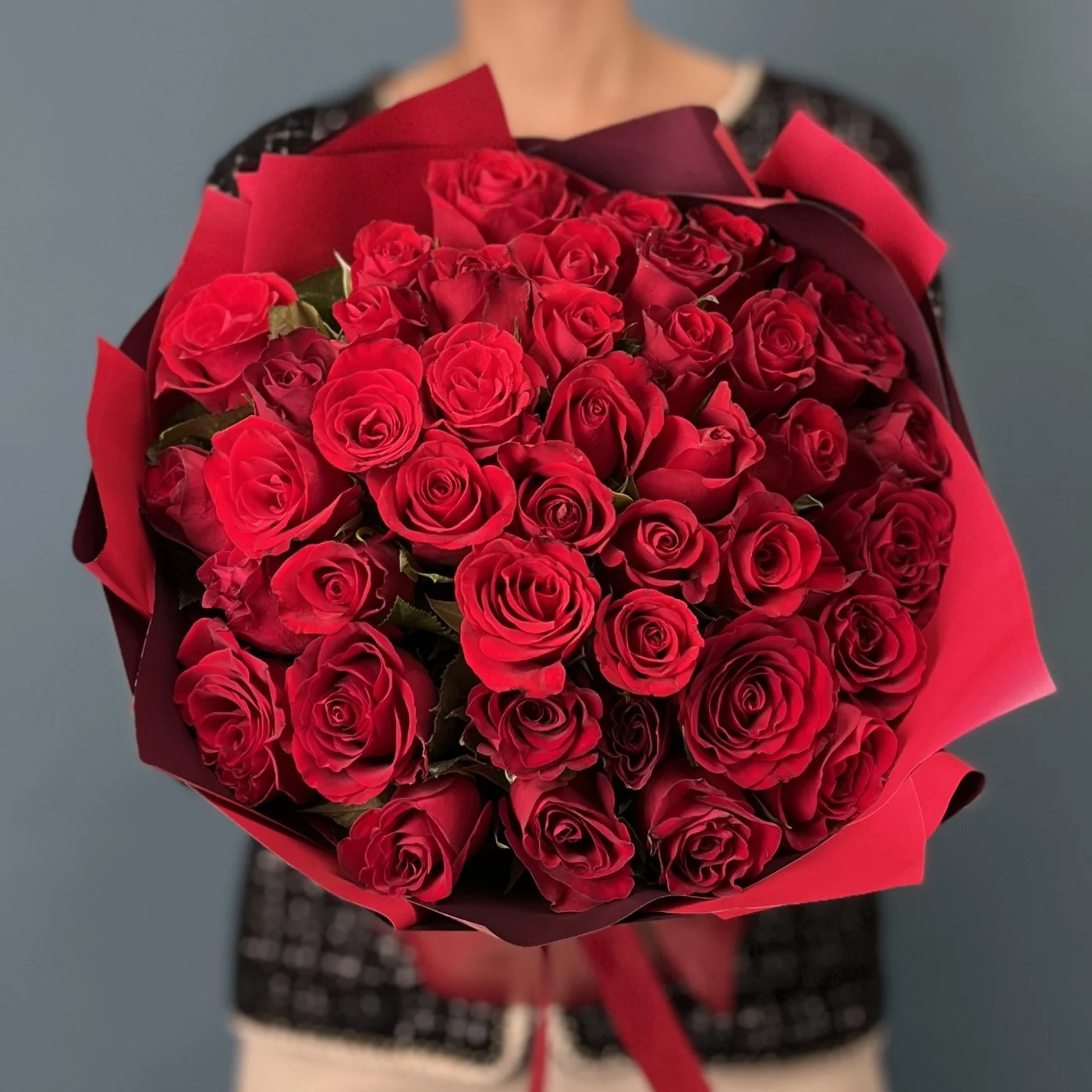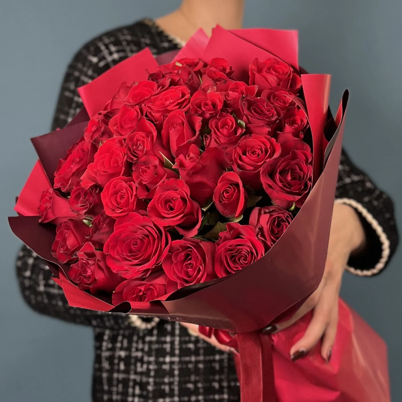 Букет из 41 красной розы — великолепный подарок на Рубиновую свадьбу, символизирующий глубокую страсть, прочность и вечную любовь супругов.