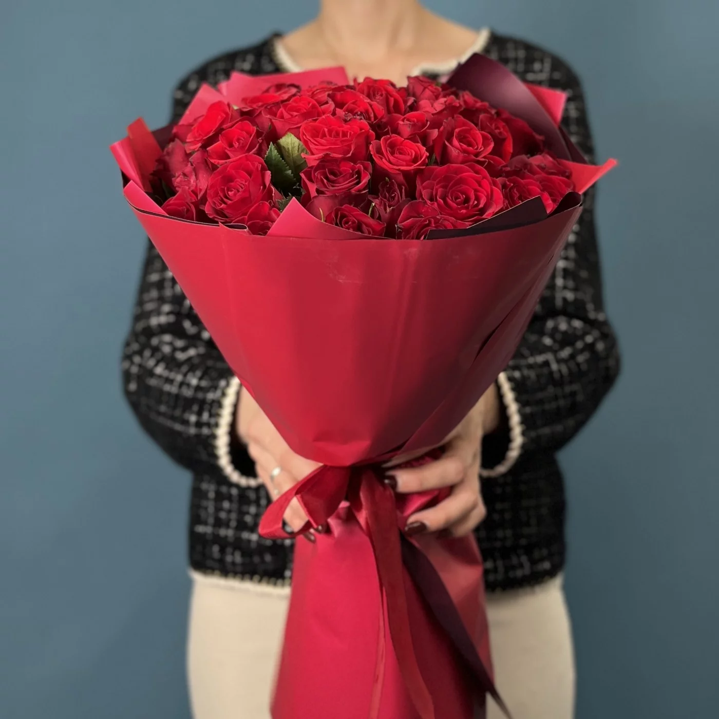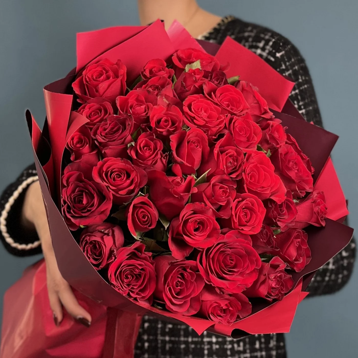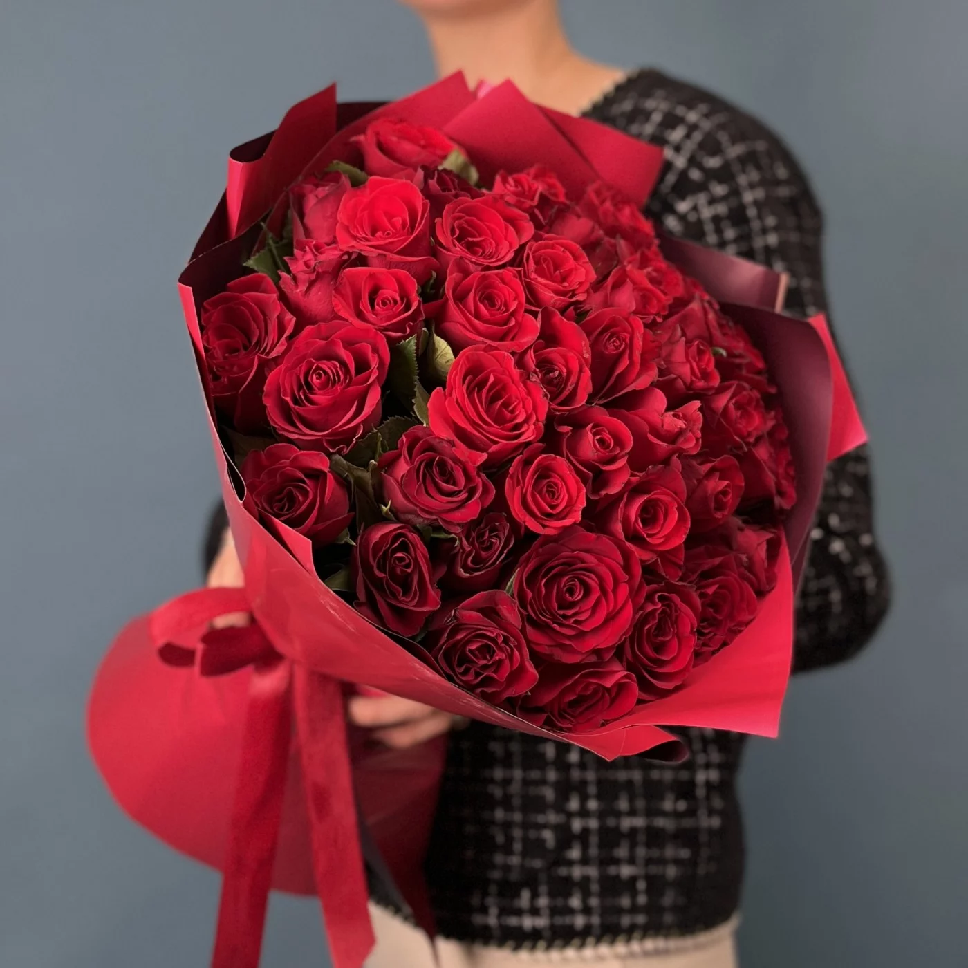 Букет из 41 красной розы — великолепный подарок на Рубиновую свадьбу, символизирующий глубокую страсть, прочность и вечную любовь супругов.