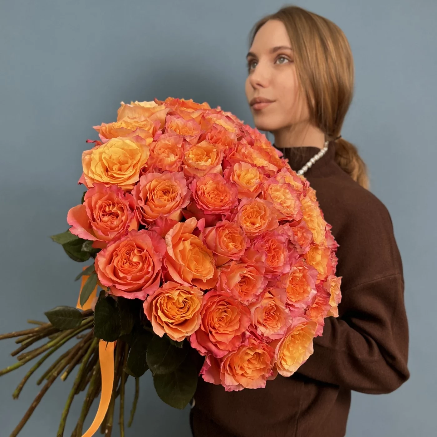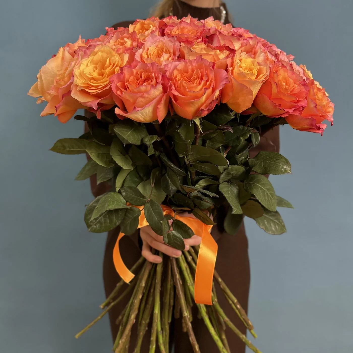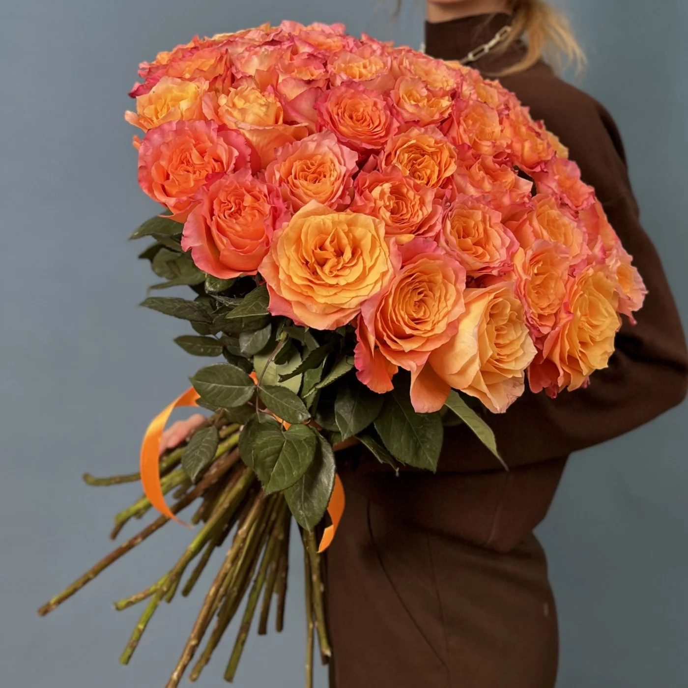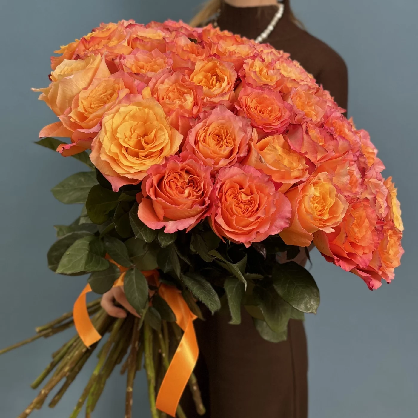 Букет из 41 розы сорта фри спирит длиной 60 см — это своеобразное флористическое произведение искусства, которое удивляет своей цветовой палитрой и изысканностью.