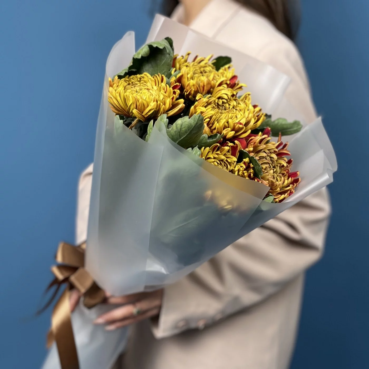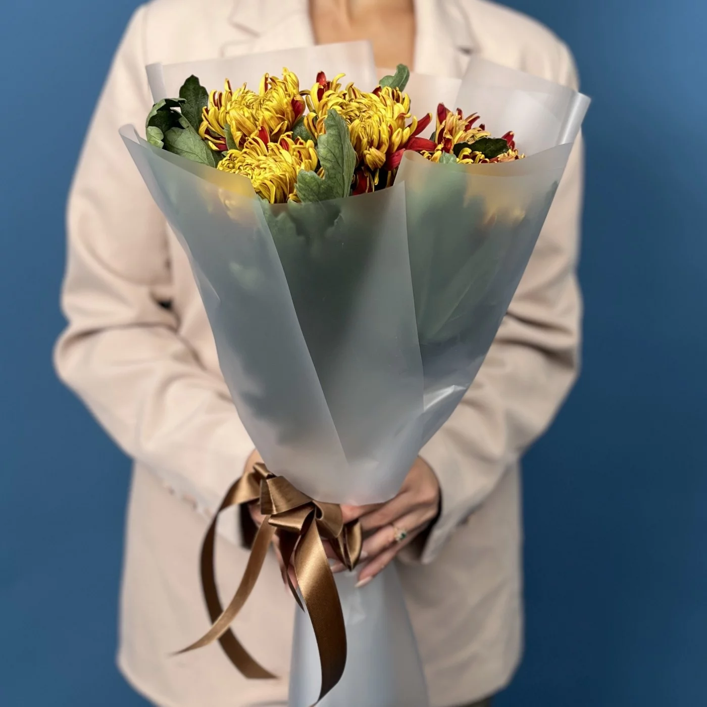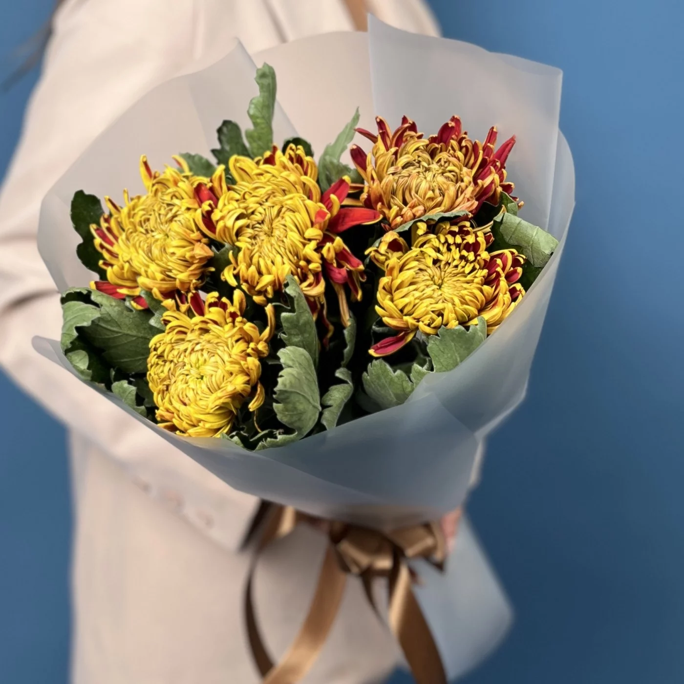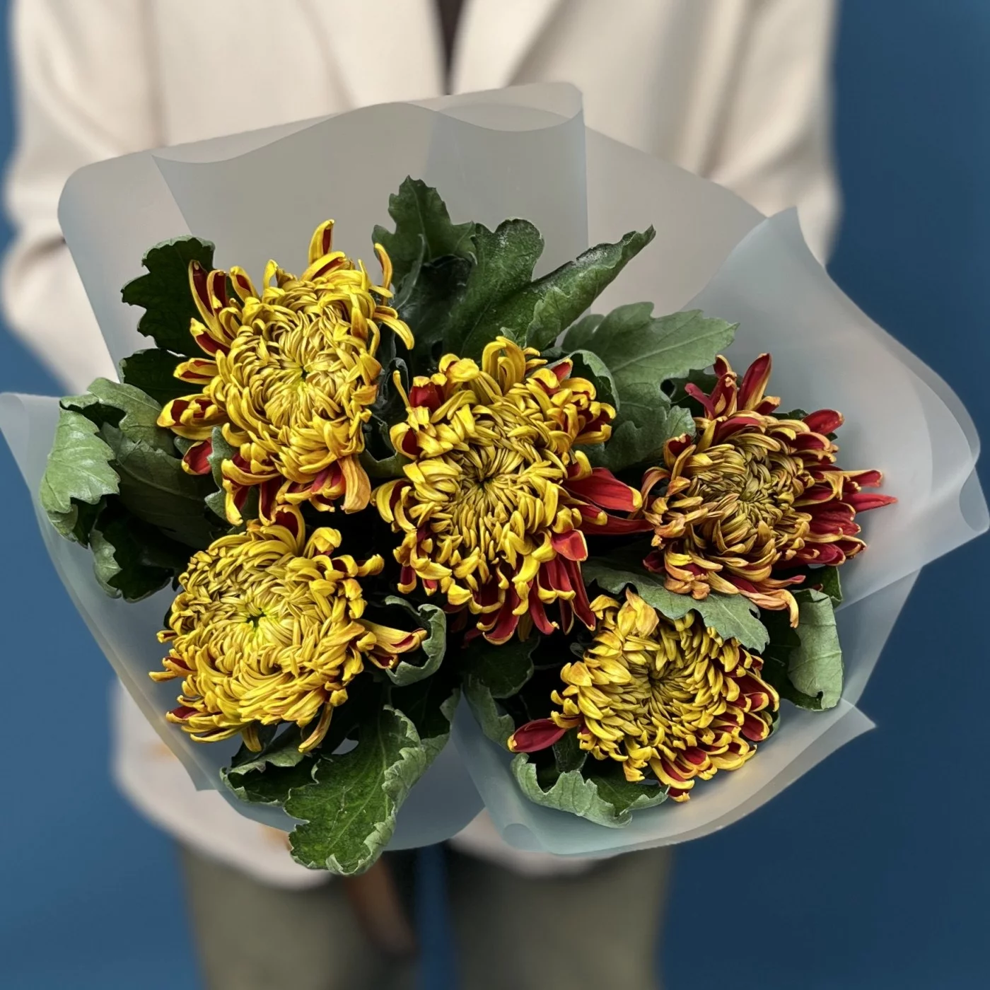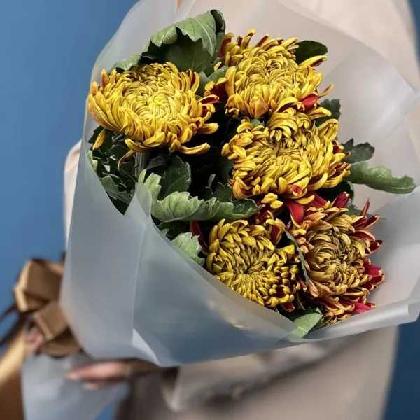 Букет из пяти хризантем Том Пирс — это яркий всплеск эмоций, созданный природой. Огненные жёлто-красные оттенки лепестков напоминают тёплый закат и делают каждую хризантему живой, динамичной и по-настоящему выразительной. Пышные соцветия формируют гармоничную, насыщенную композицию, которая выглядит удивительно эффектно даже в компактном исполнении. Такой букет наполняет пространство светом, создаёт атмосферу радости и будто переносит частичку осени в руки получателя.