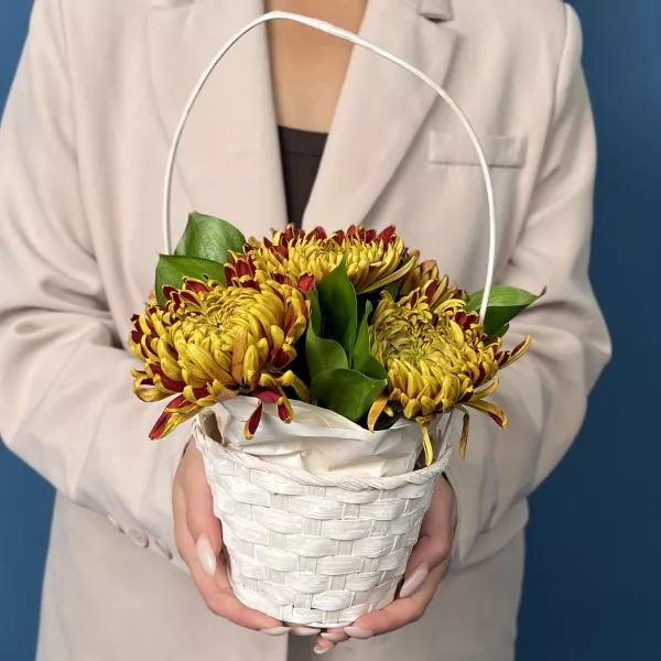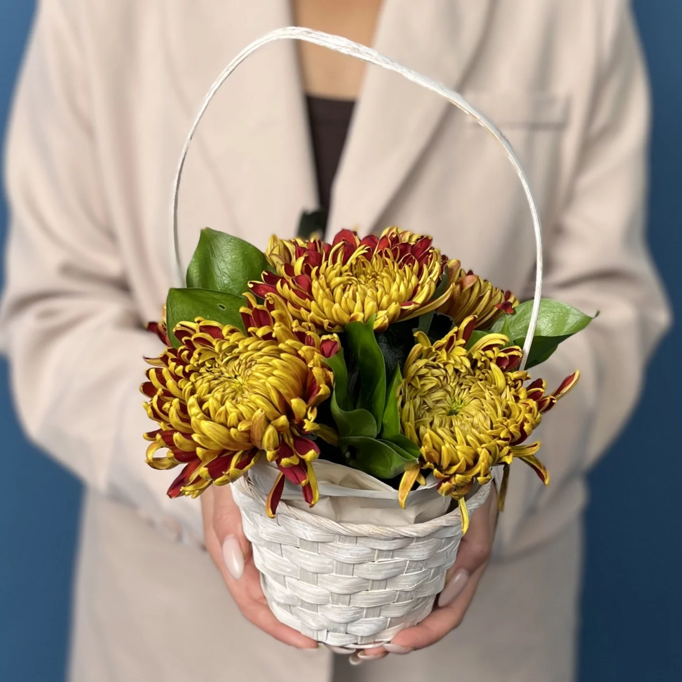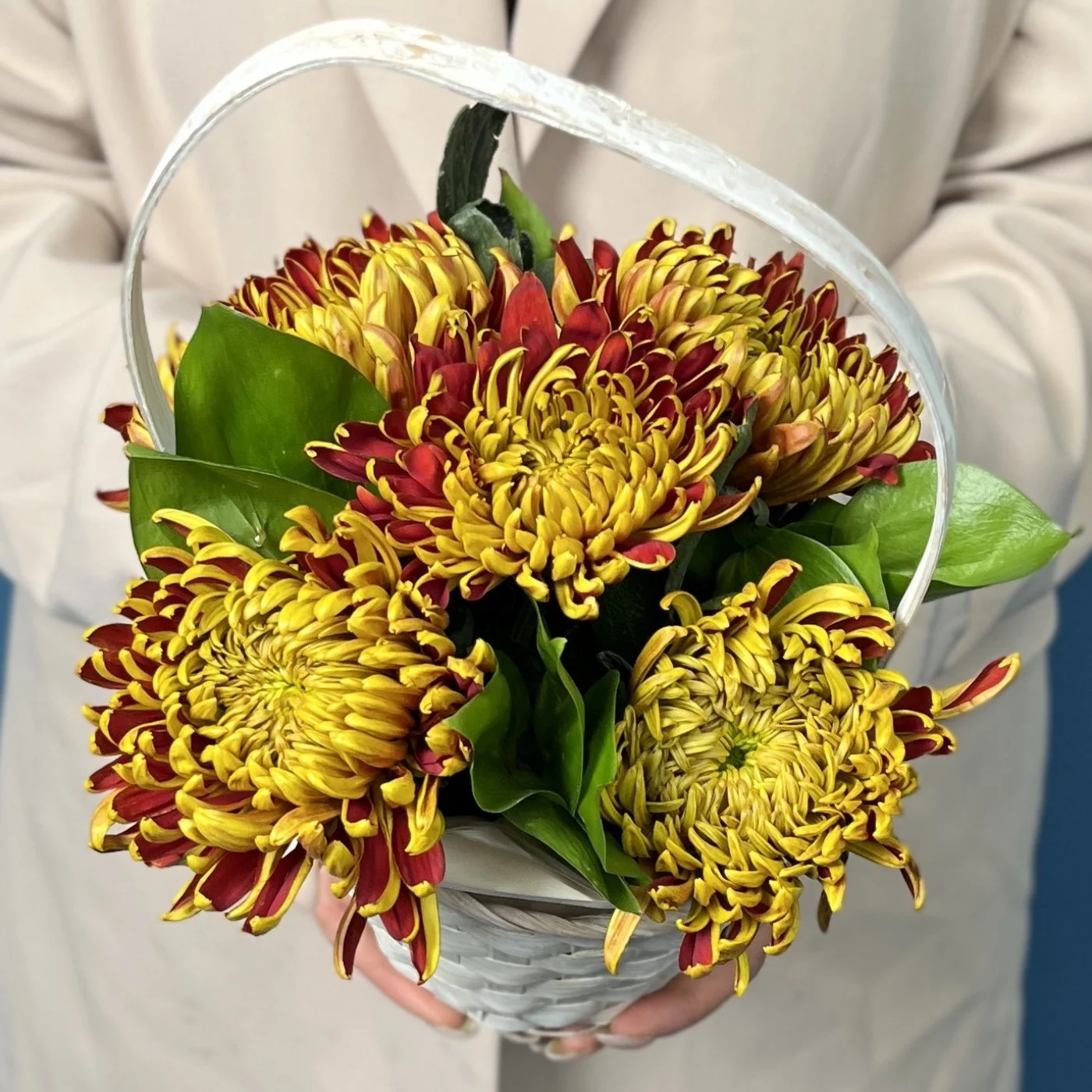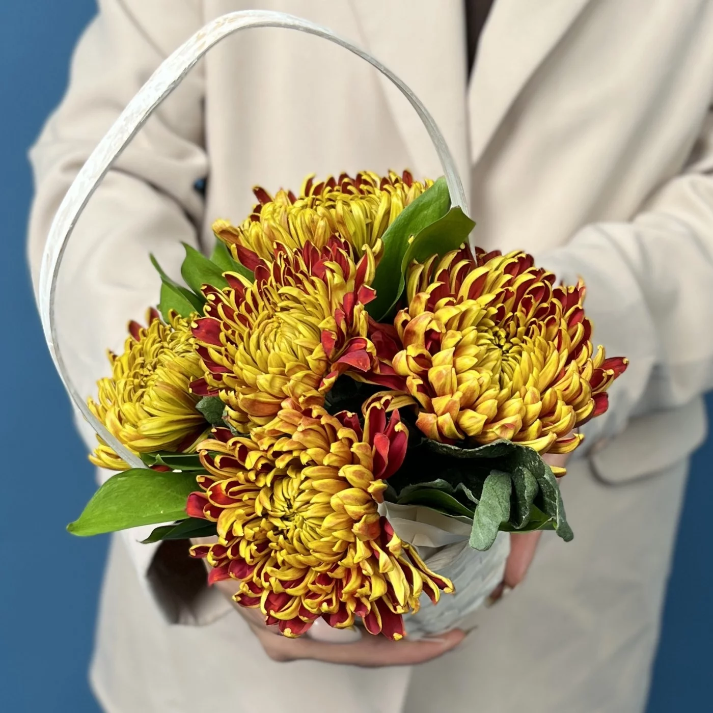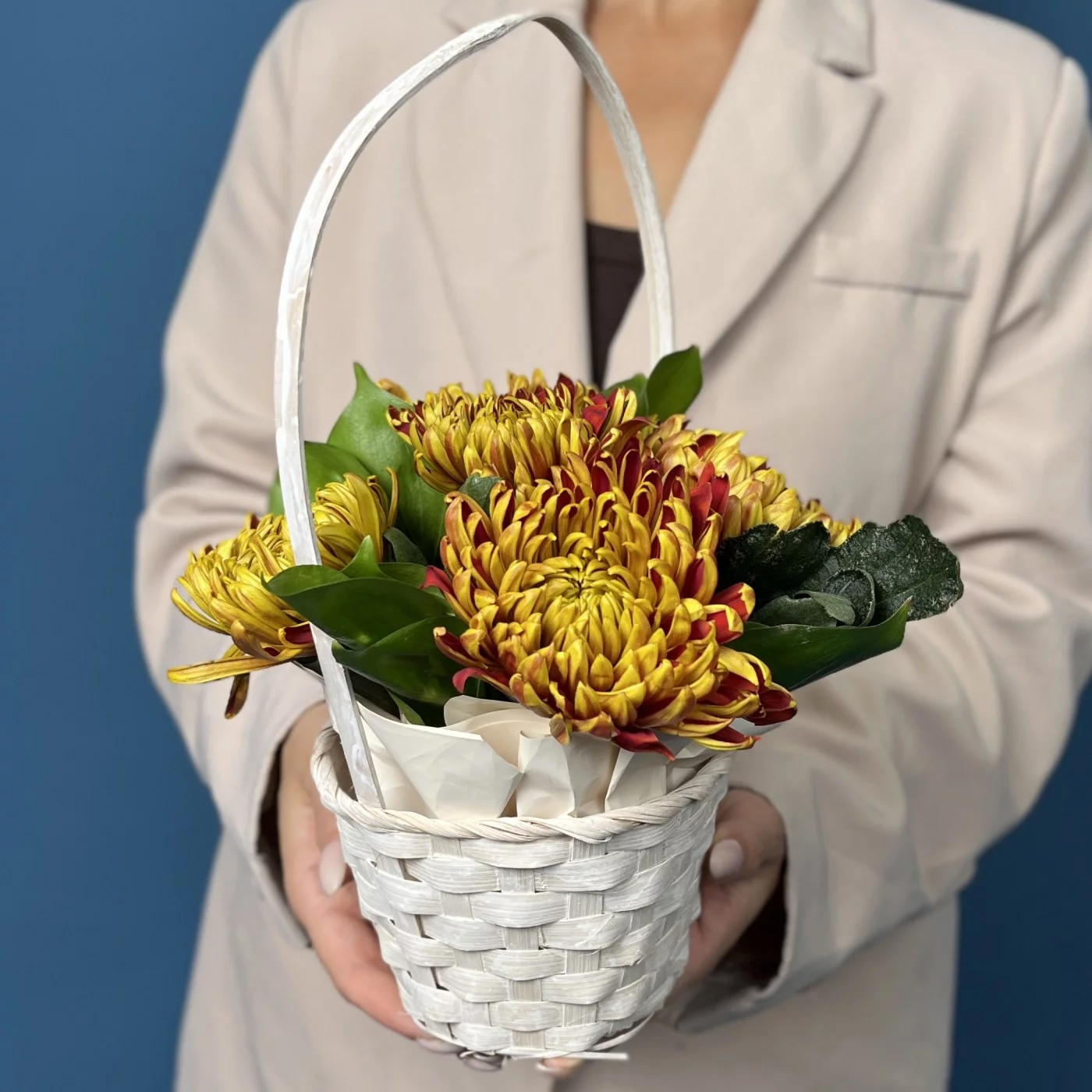 Очаровательный букет из пяти крупные хризантем насыщенных желто-красных оттенков, красиво оформленных в подарочную корзину. Этот яркий и живой композиционный подарок наполнит атмосферу теплом и радостью, идеально подходящий для поздравлений и выражения искренних чувств.