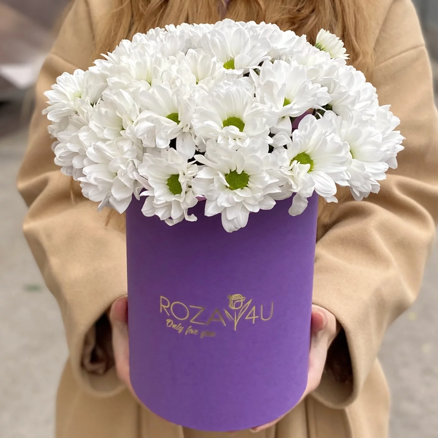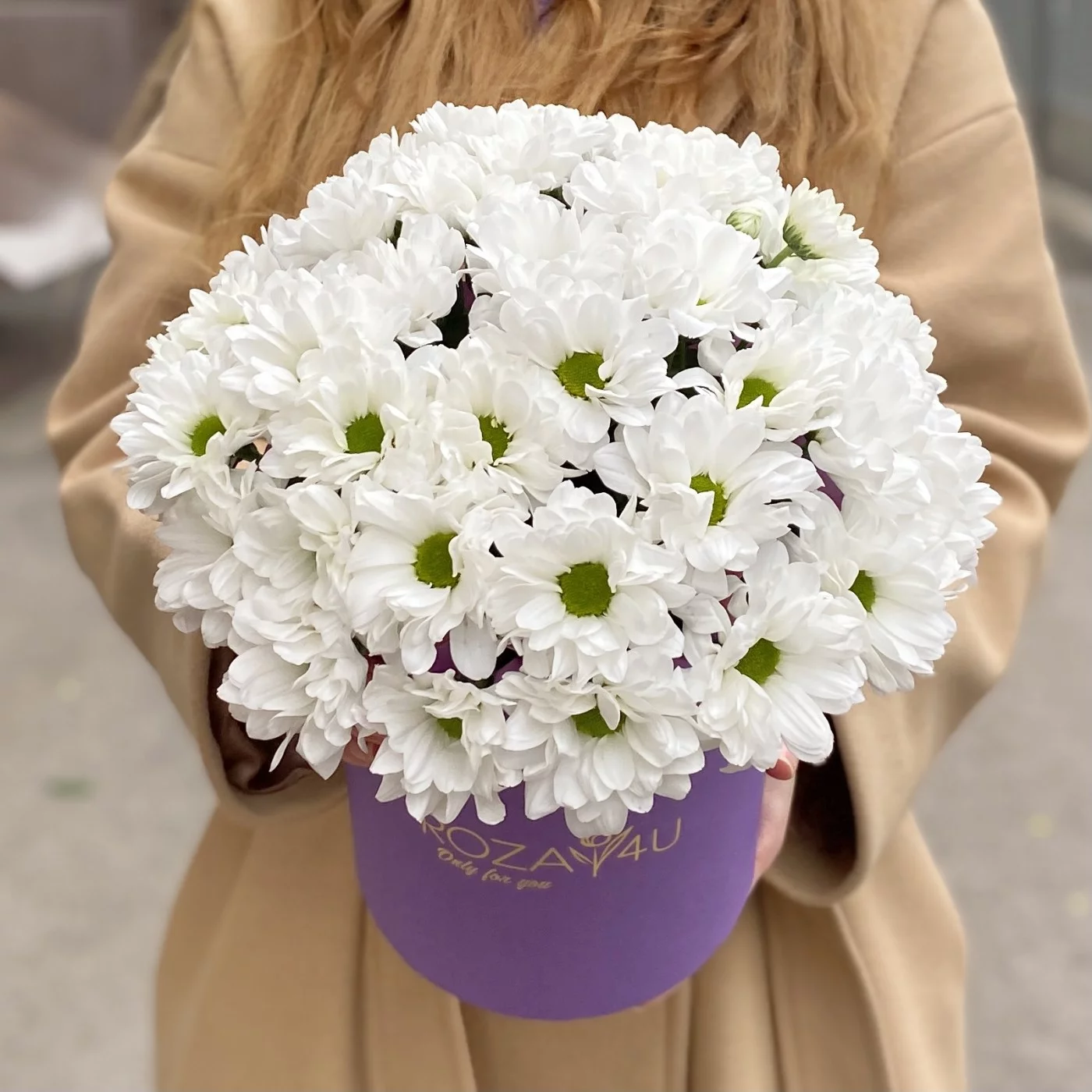5 белых хризантем в шляпной коробке станет оригинальным подарком в День Матери.