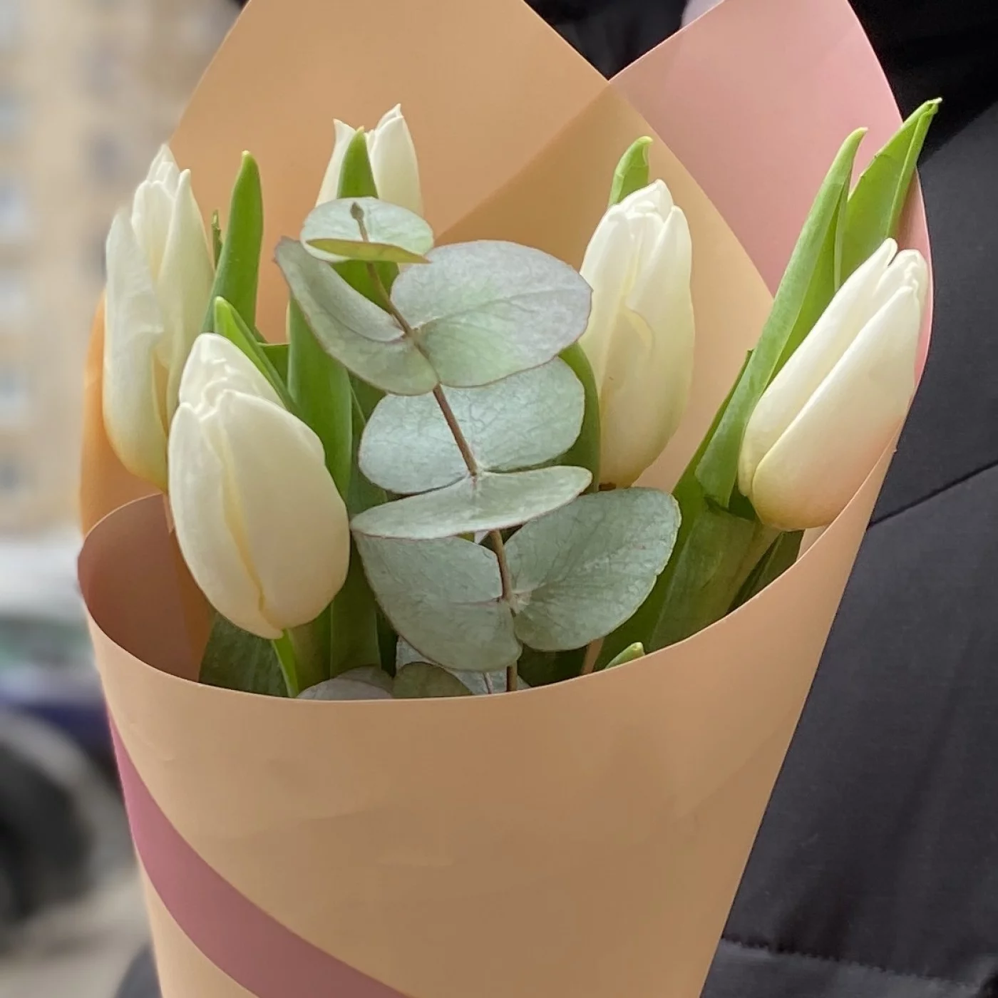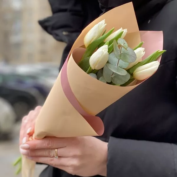 Мини букет из тюльпанов белого цвета в стильной упаковке. Прекрасный корпоративный вариант подарка на 8 марта.