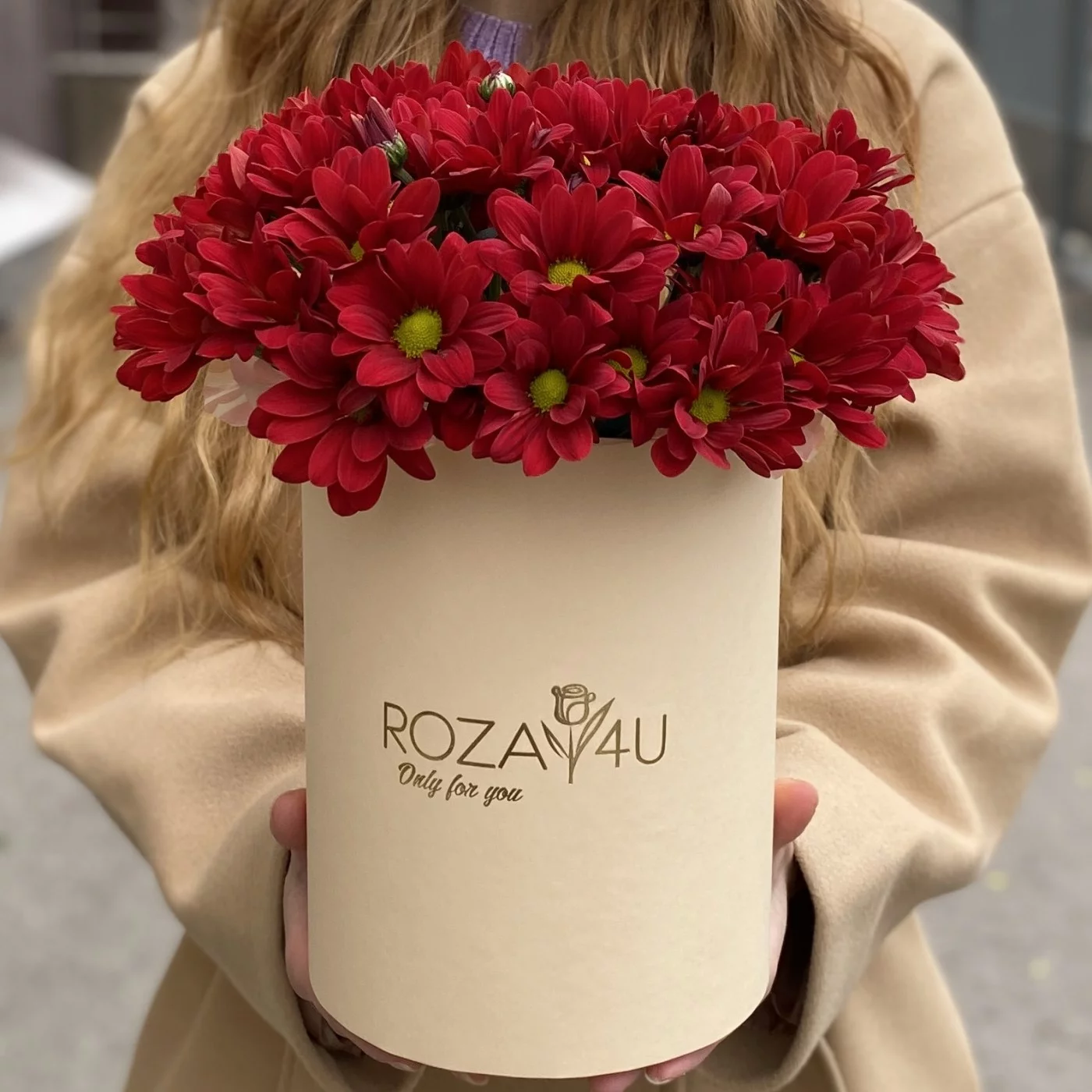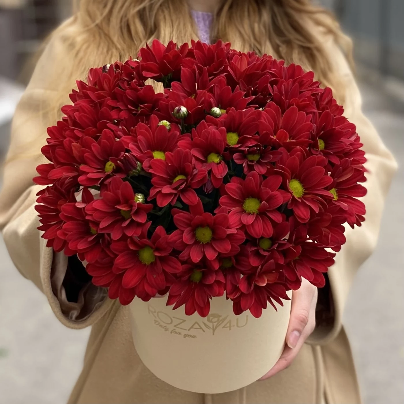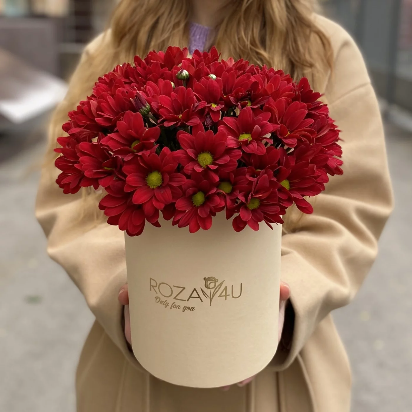 5 бордовых хризантем в шляпной коробке станет оригинальным подарком.