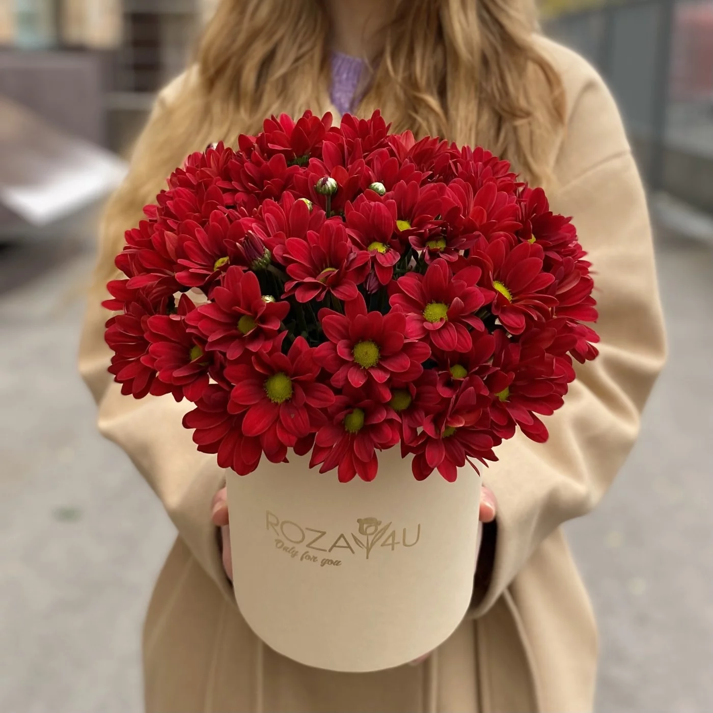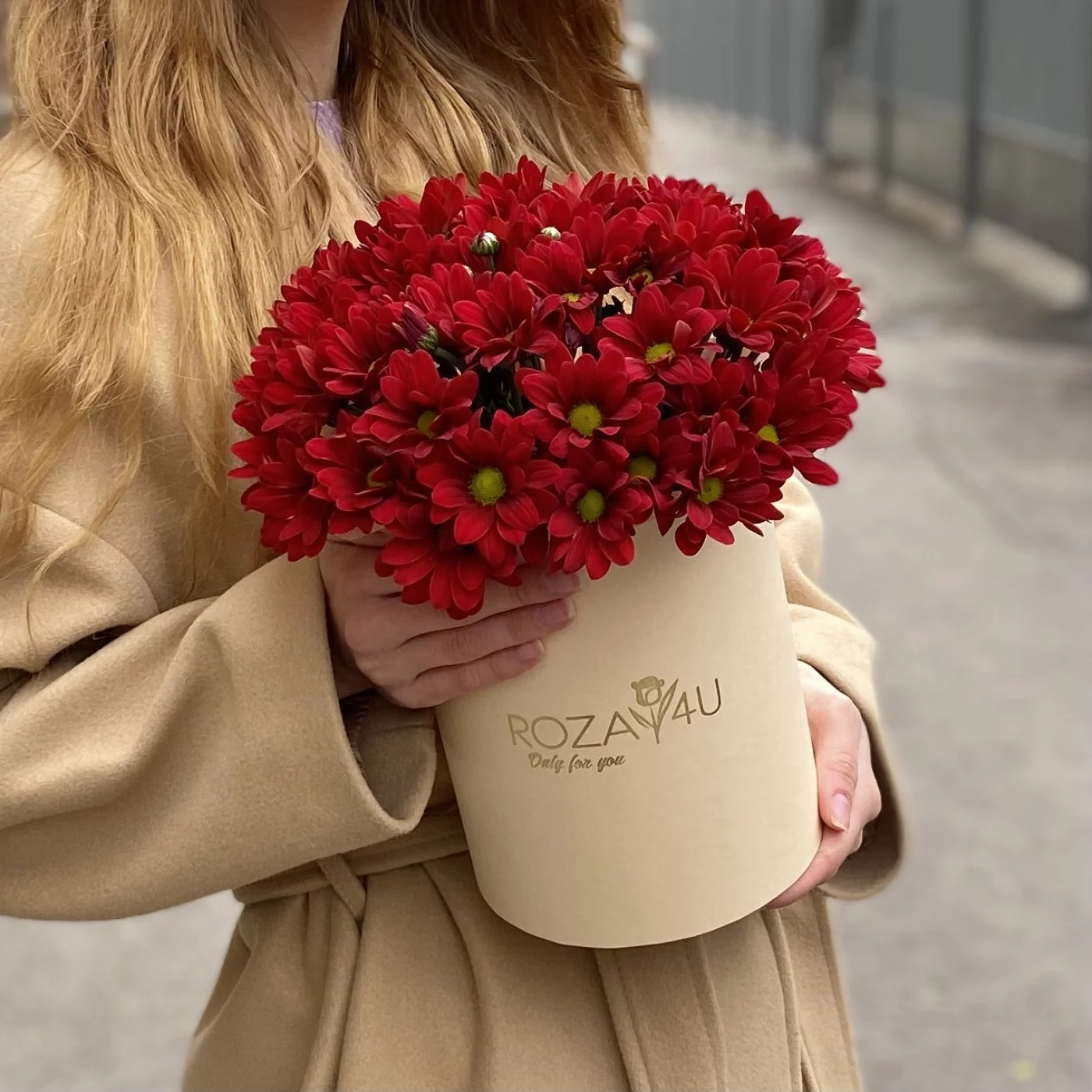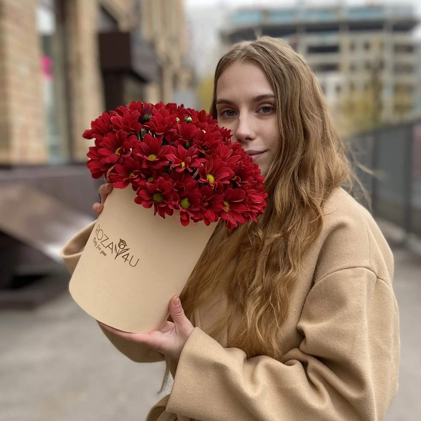 5 бордовых хризантем в шляпной коробке станет оригинальным подарком.