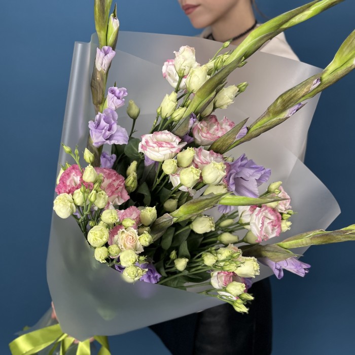 Букет из 5 фиолетовых гладиолусов с эустомой — это великолепное сочетание, которое привнесет в ваш интерьер атмосферу элегантности и романтики. Фиолетовые гладиолусы, символизирующие силу и благородство, прекрасно дополняются нежными цветами эустомы, создавая гармоничное и стильное оформление.