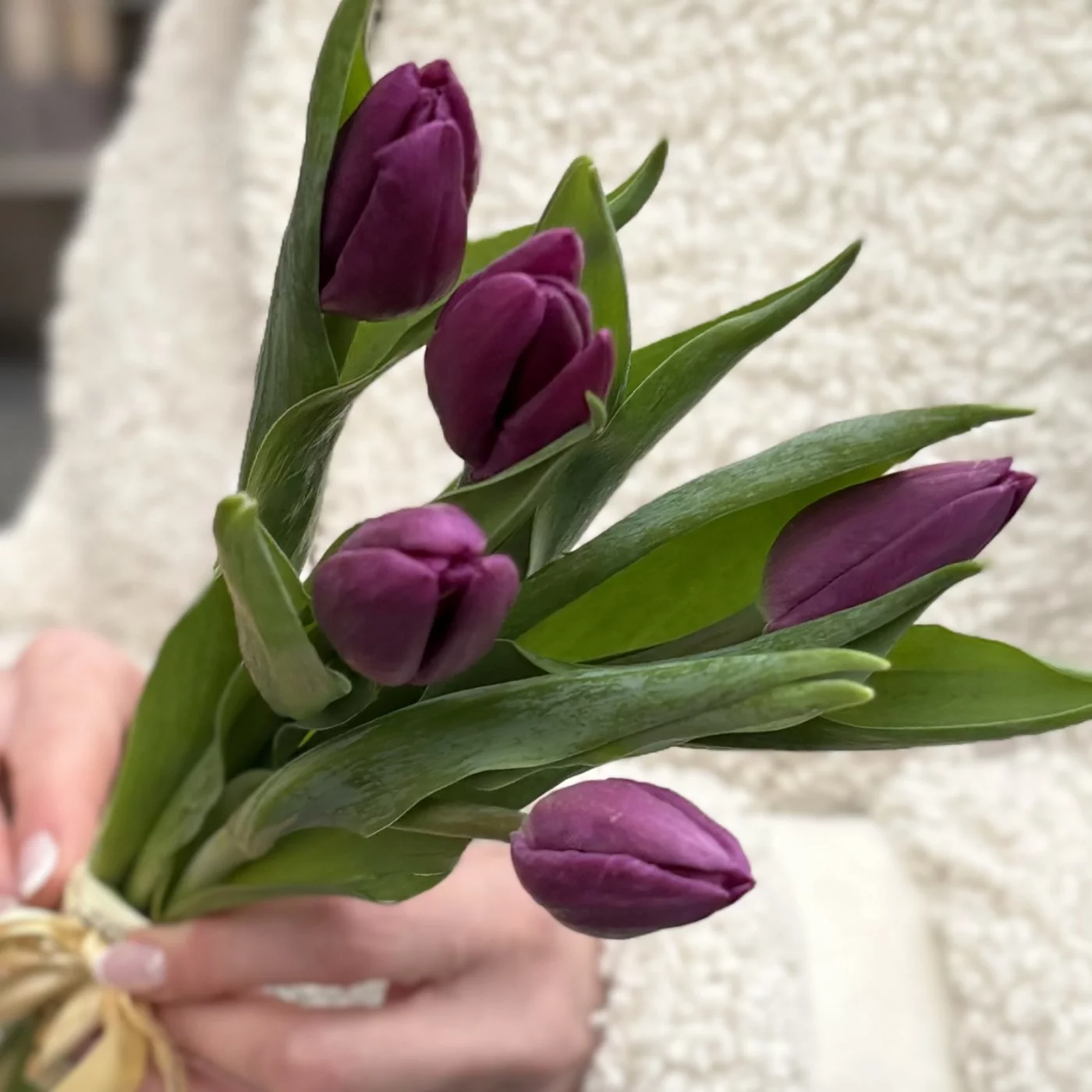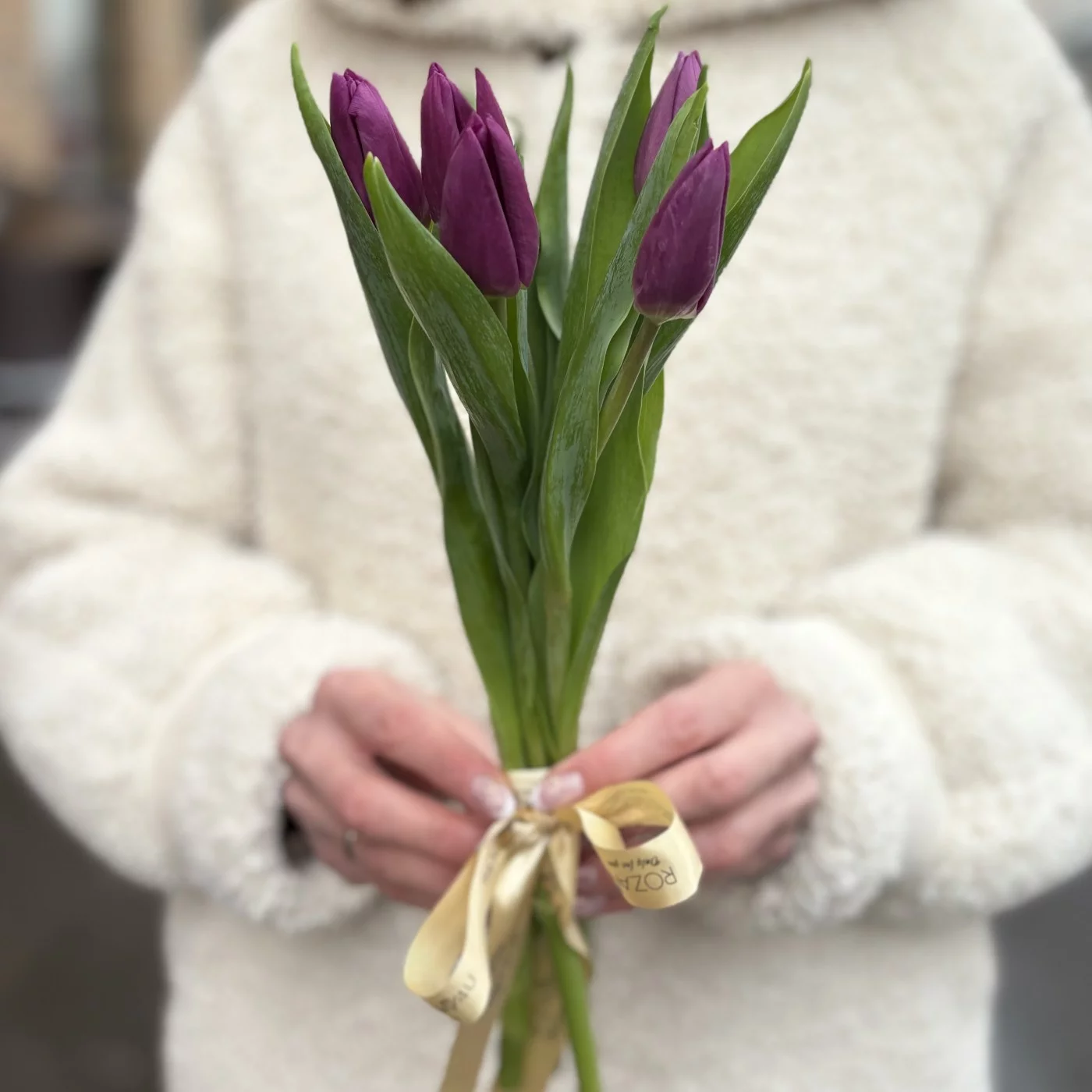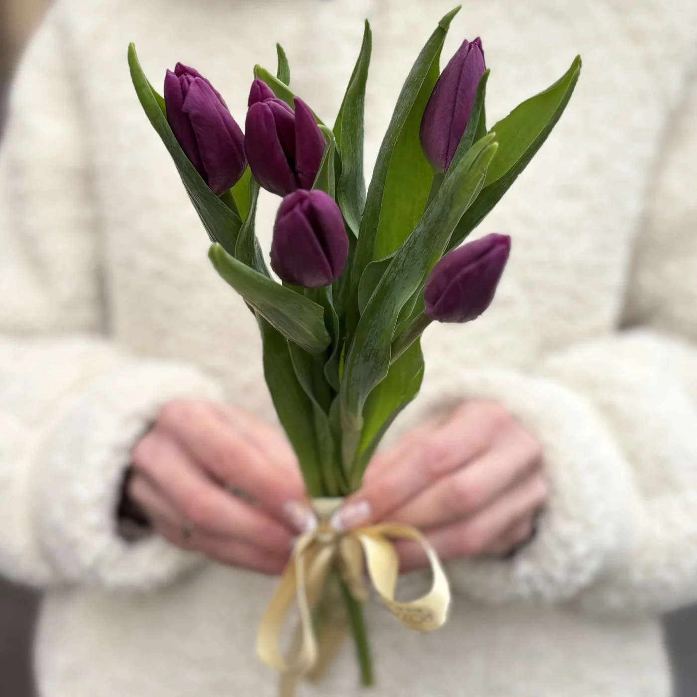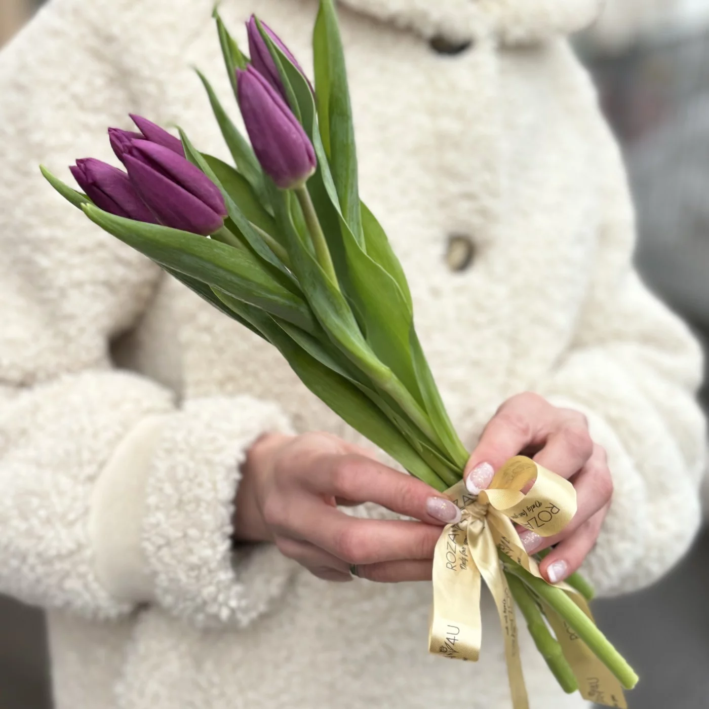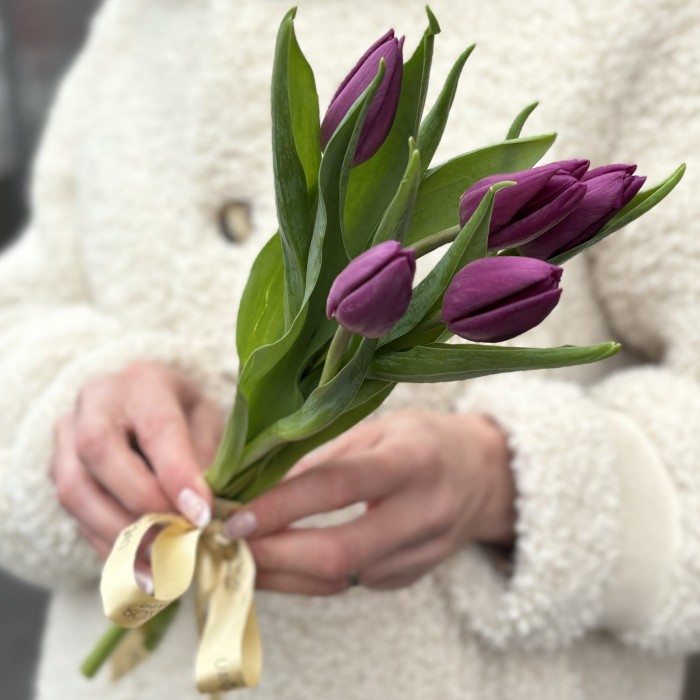 Мини букет из 5 тюльпанов фиолетового цвета в стильной упаковке. Прекрасный корпоративный вариант подарка на 8 марта.