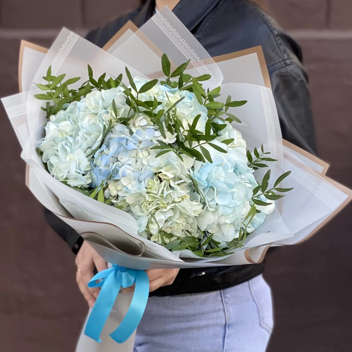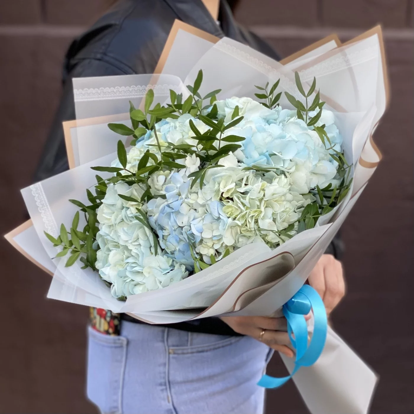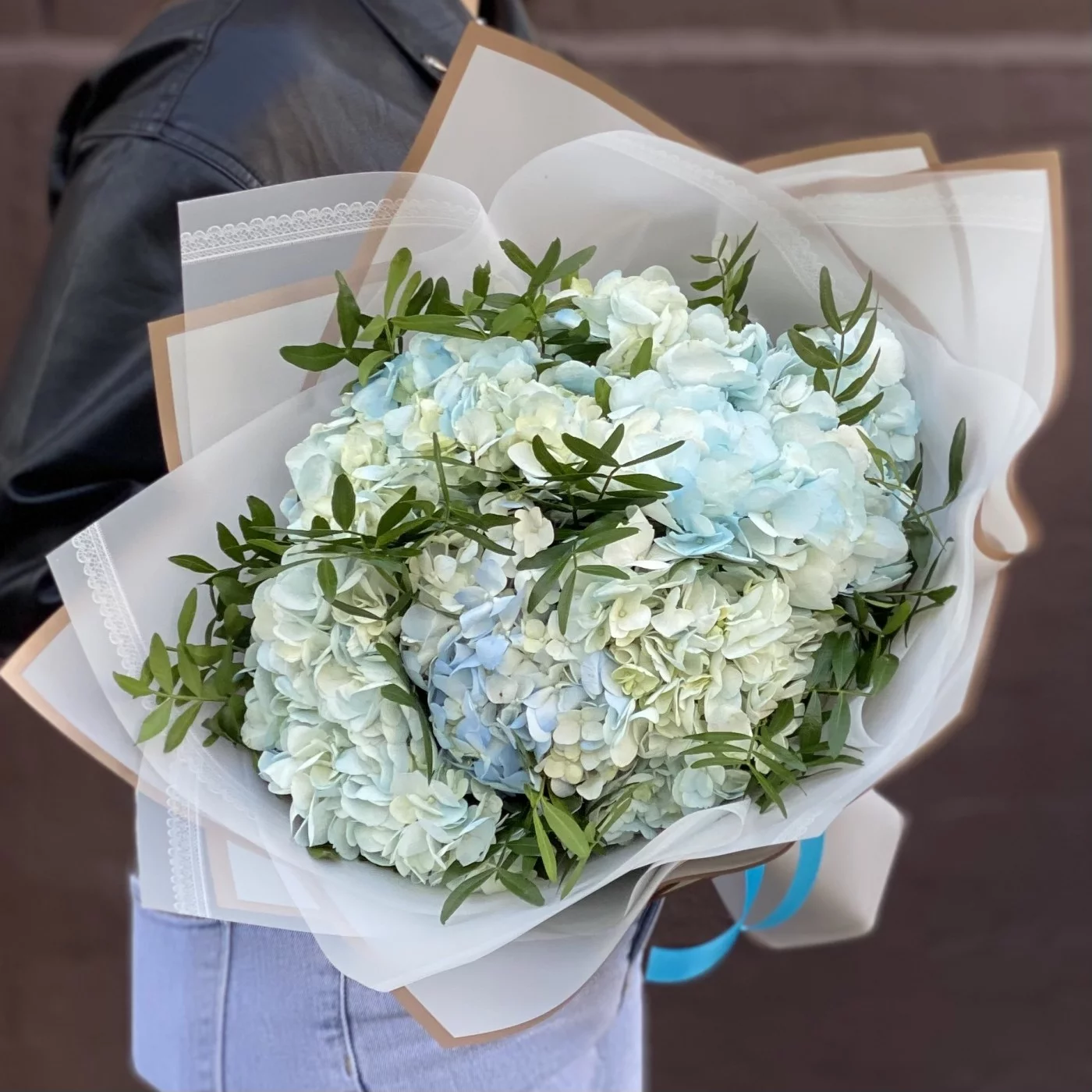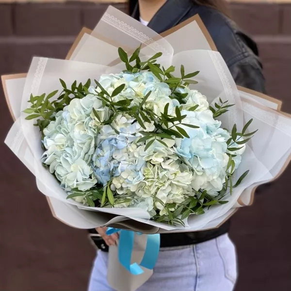 Букет из голубых гортензий с добавлением фисташки в стильной корейской упаковке.