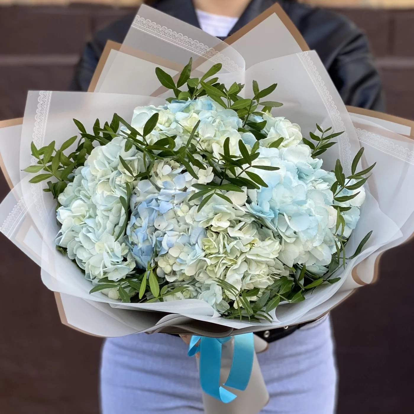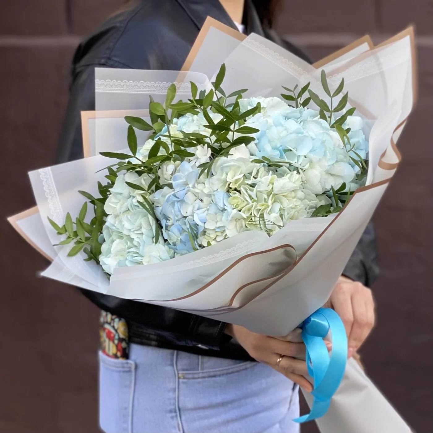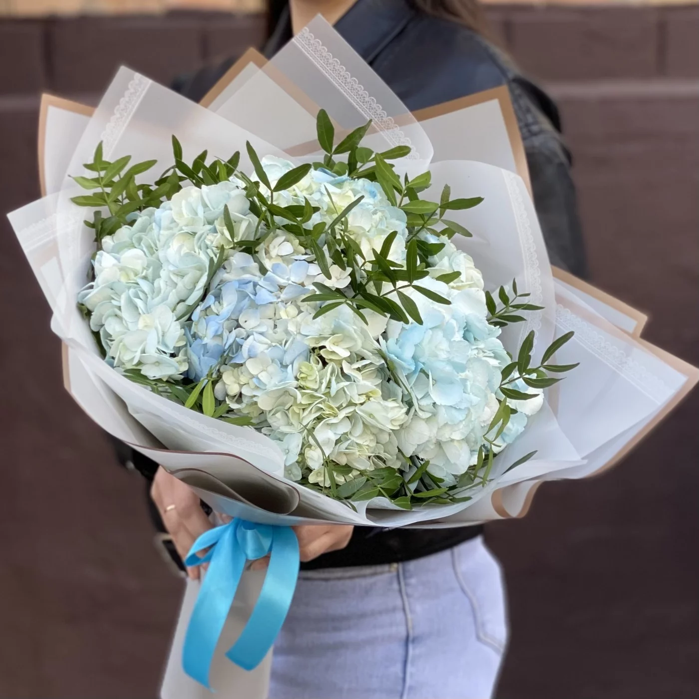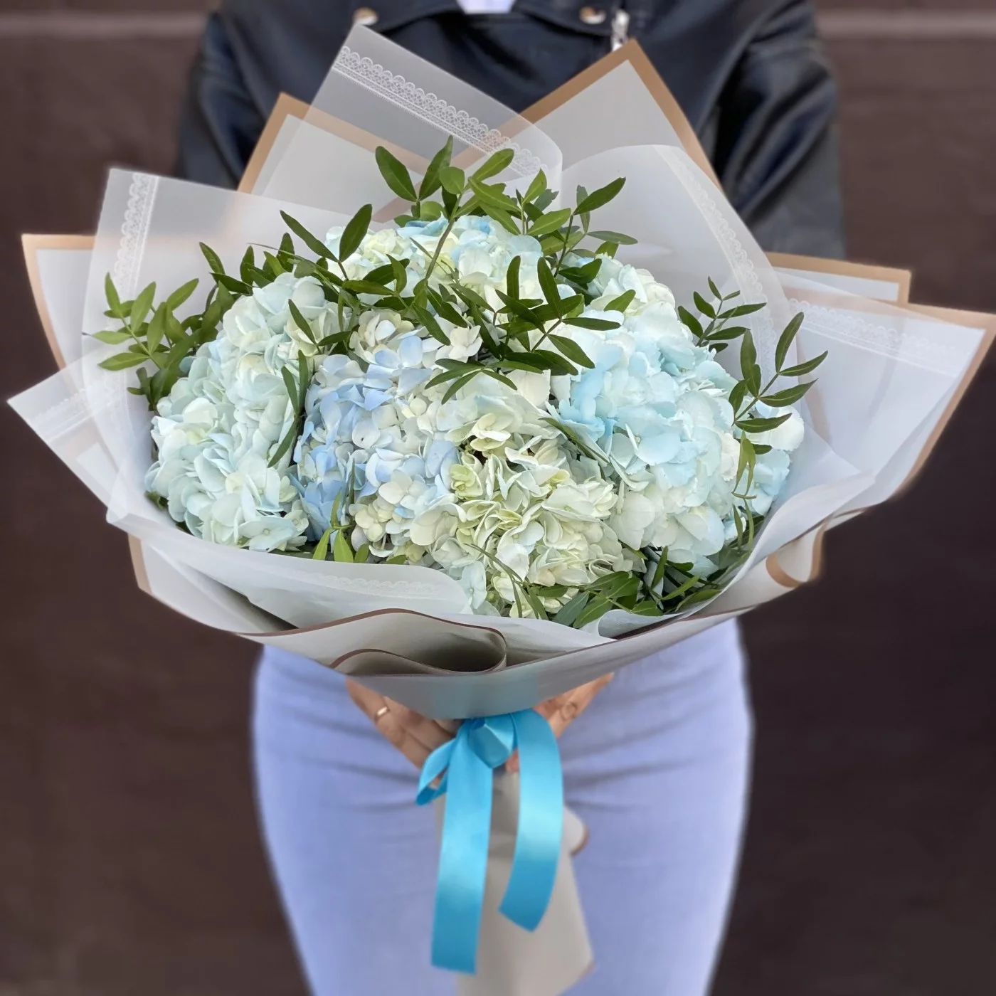 Букет из голубых гортензий с добавлением фисташки в стильной корейской упаковке.