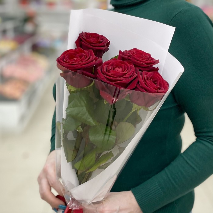 5 красных ароматных роз в упаковке