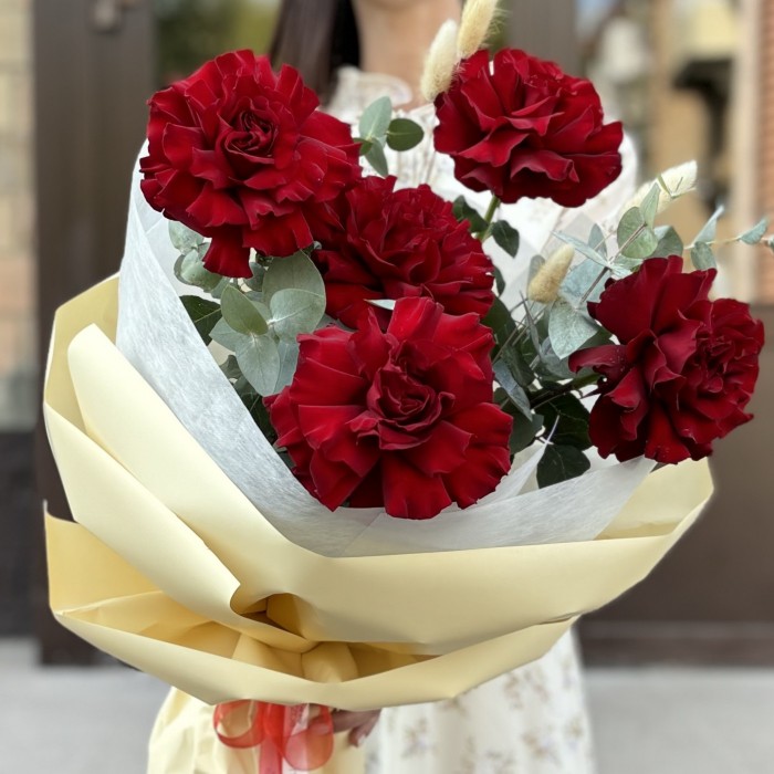 Ярко-красный букет из ароматных пышных роз – беспроигрышный вариант, если предстоит встреча с любимым человеком, торжественный банкет, день рождения близких или друзей. Великолепие необычных красных роз изысканно подчеркивается эвкалиптом и сухоцветами лагуруса, такая композиция выглядит торжественно и ярко, создавая атмосферу праздника, важного в жизни события.