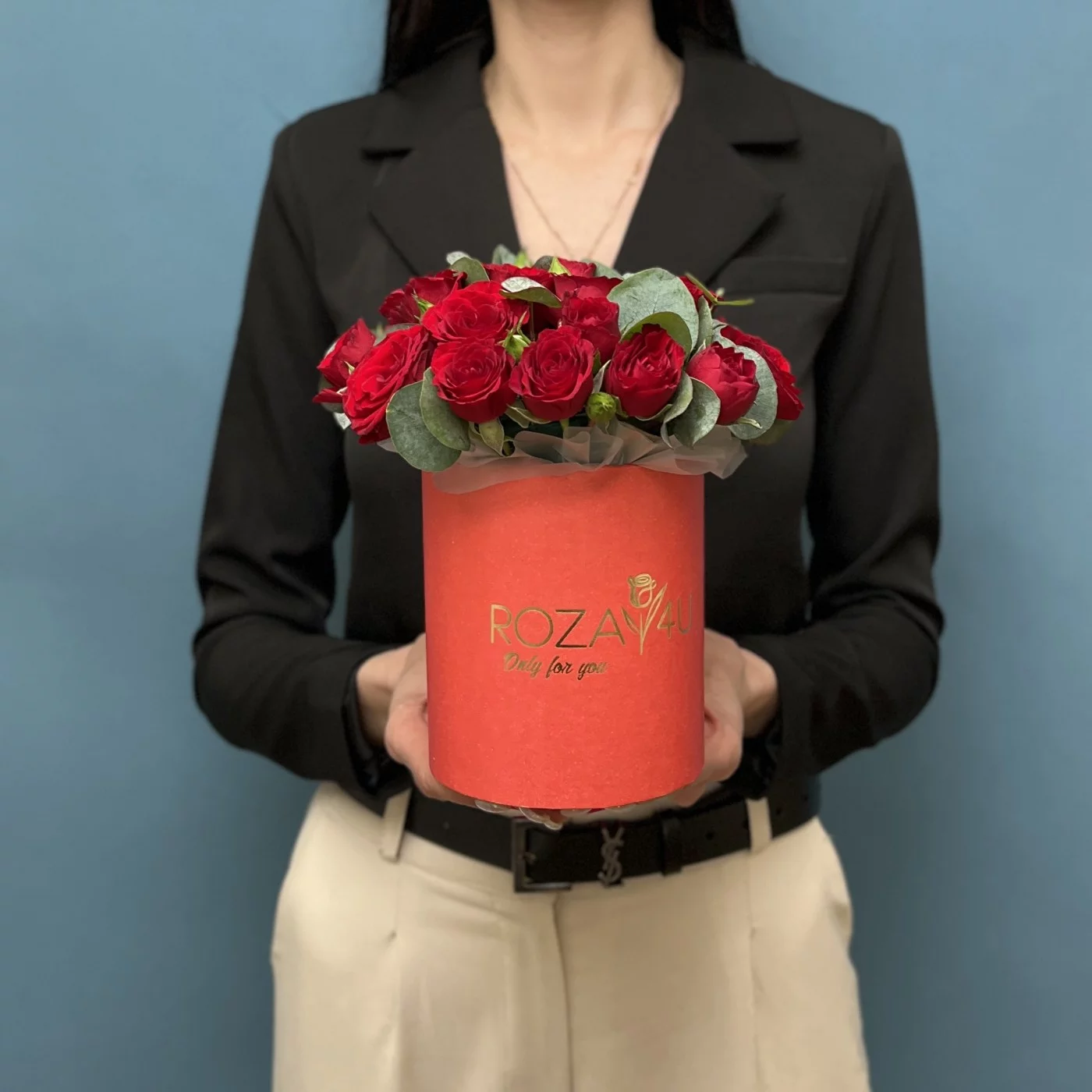 Яркие кустовые розы красного цвета в красной коробке.