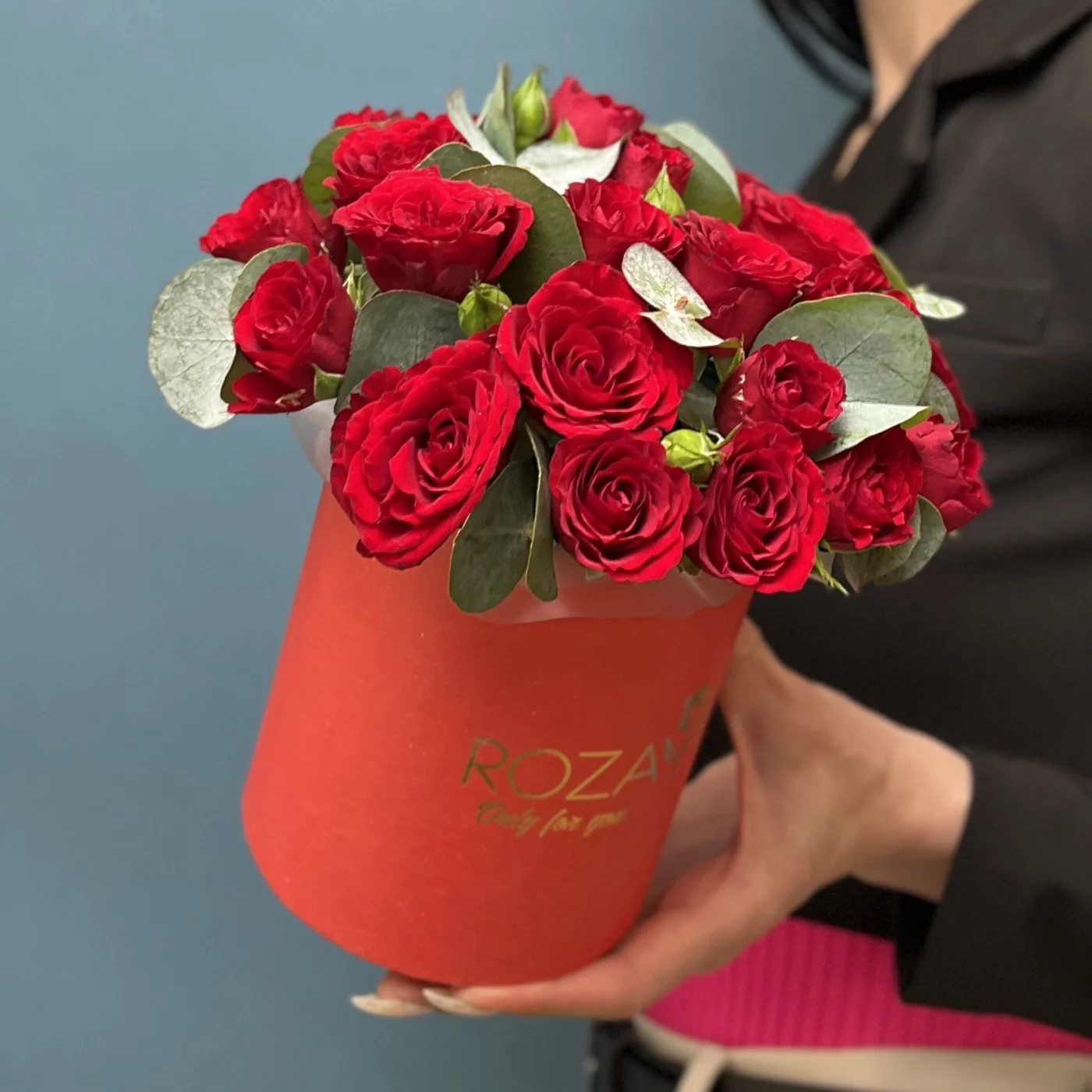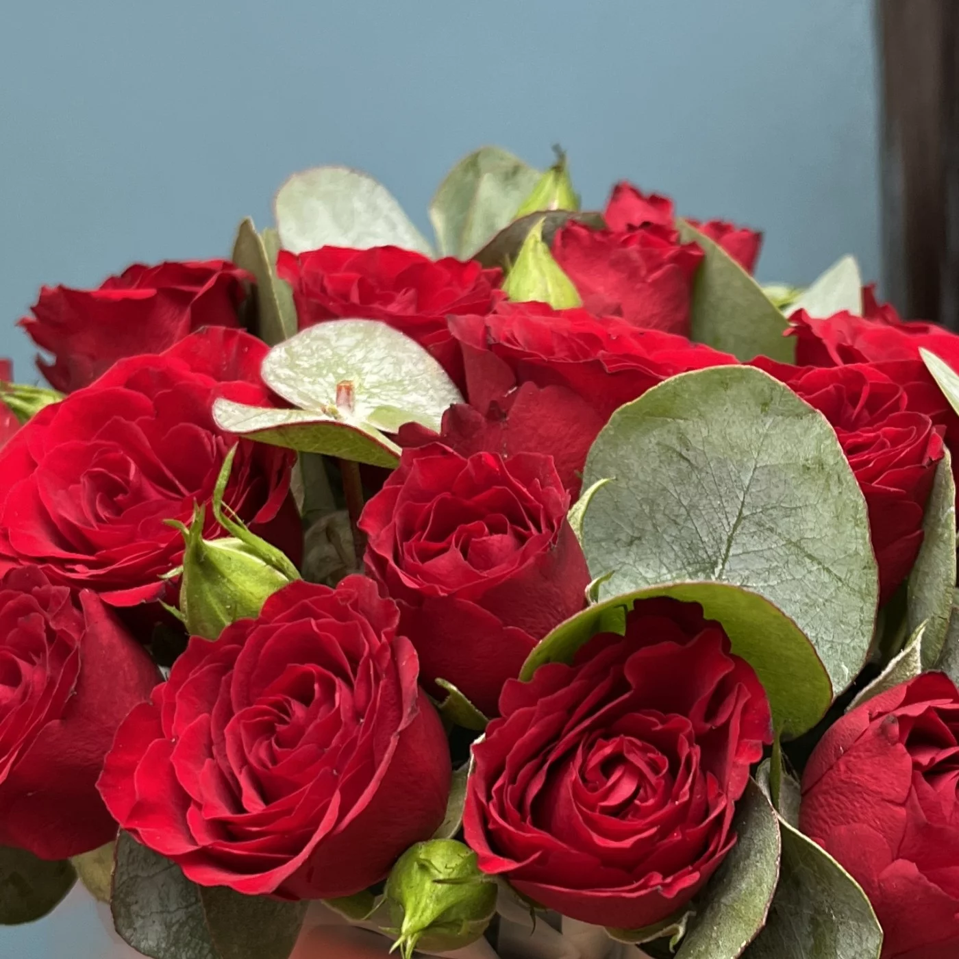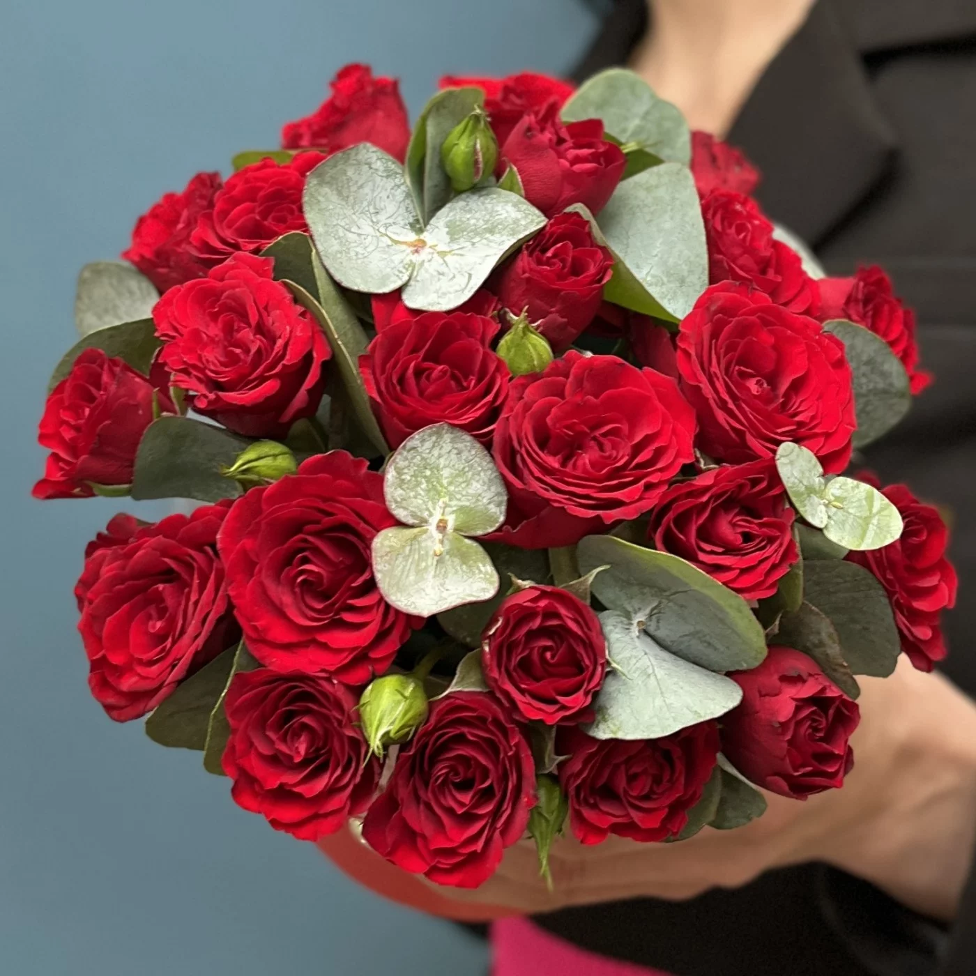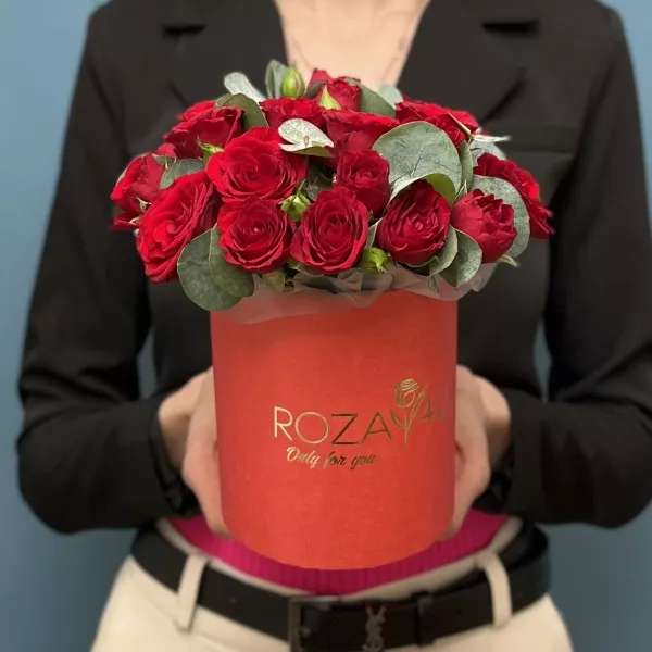 5 красных кустовых роз Рубикон с эвкалиптом в коробке
