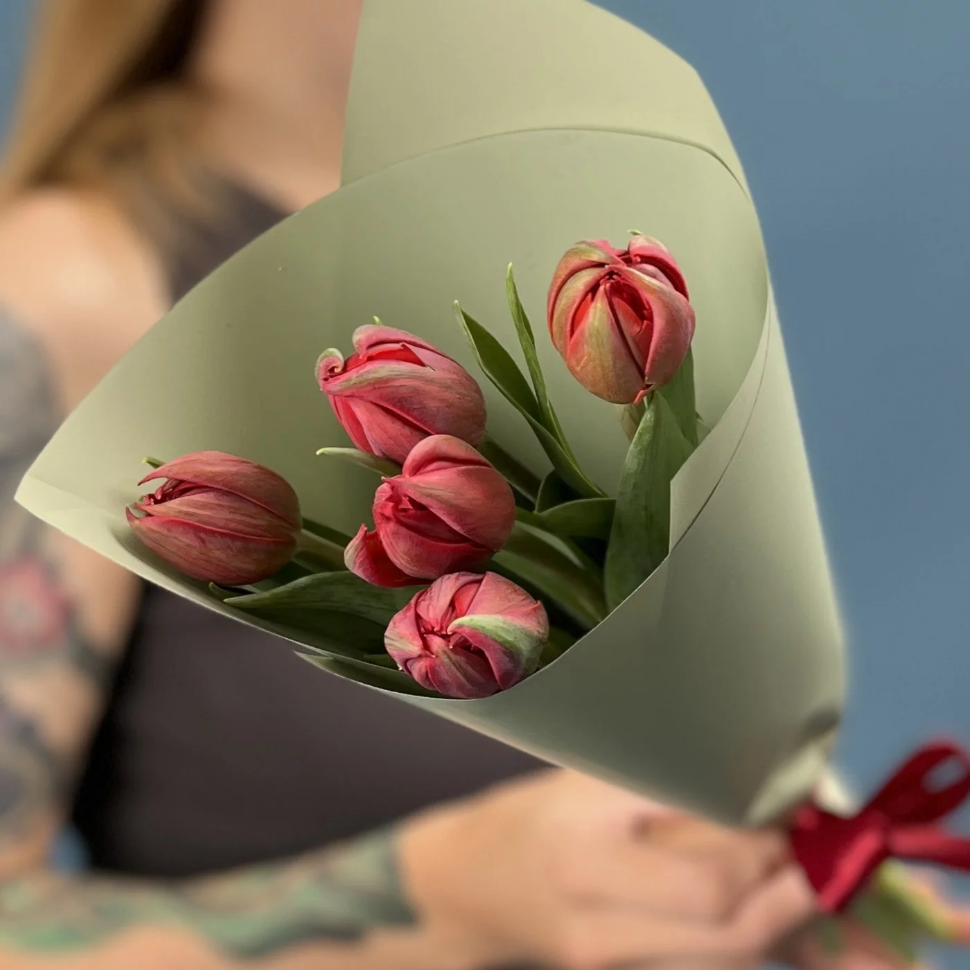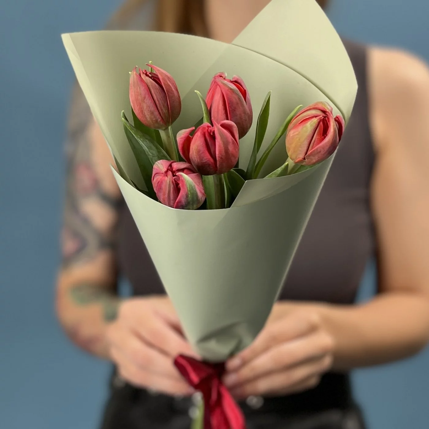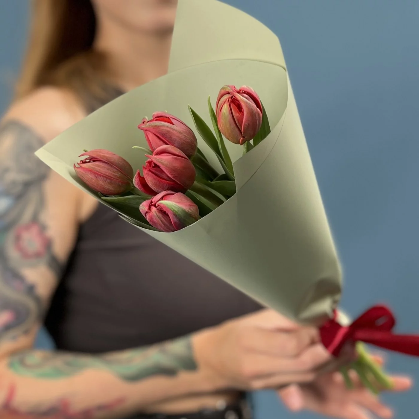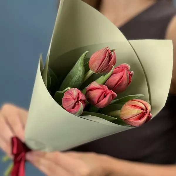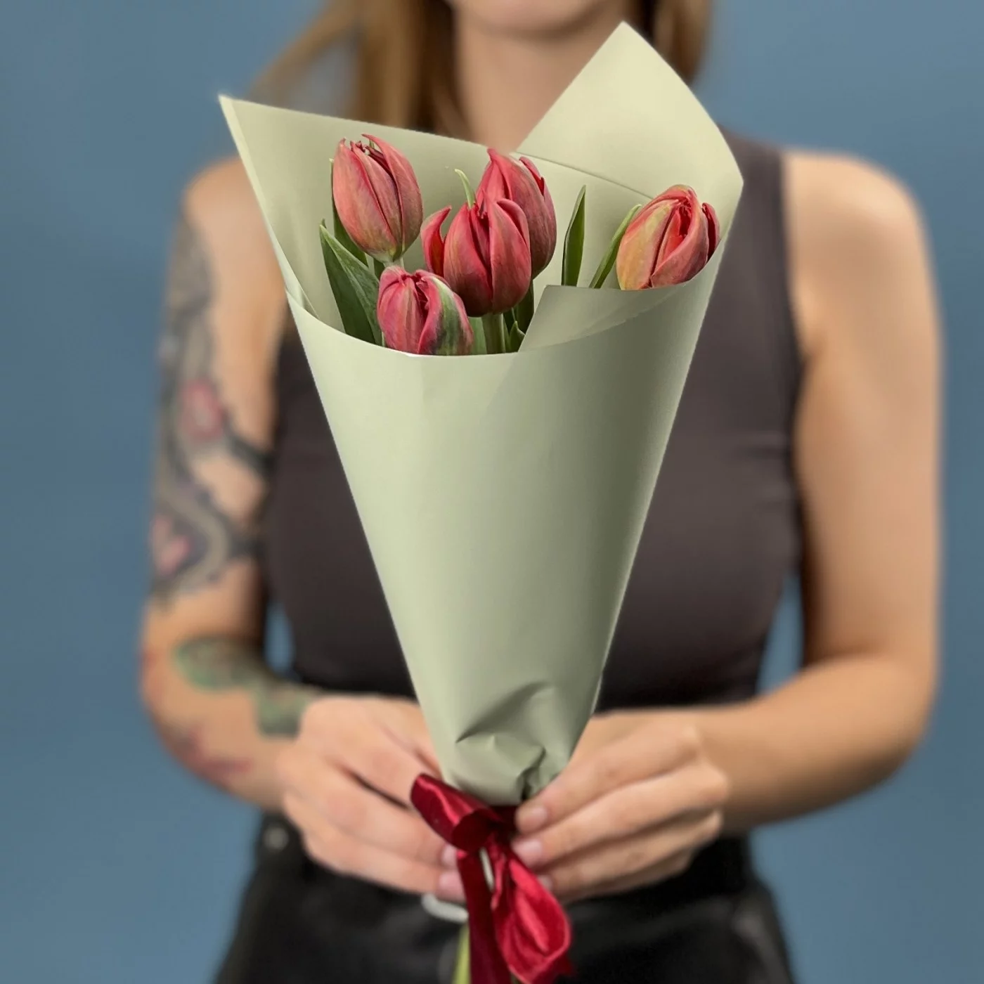 Очаровательная композиция из 5 красных пионовидных тюльпанов сорта Ред Принц — это символ страсти, элегантности и яркости.