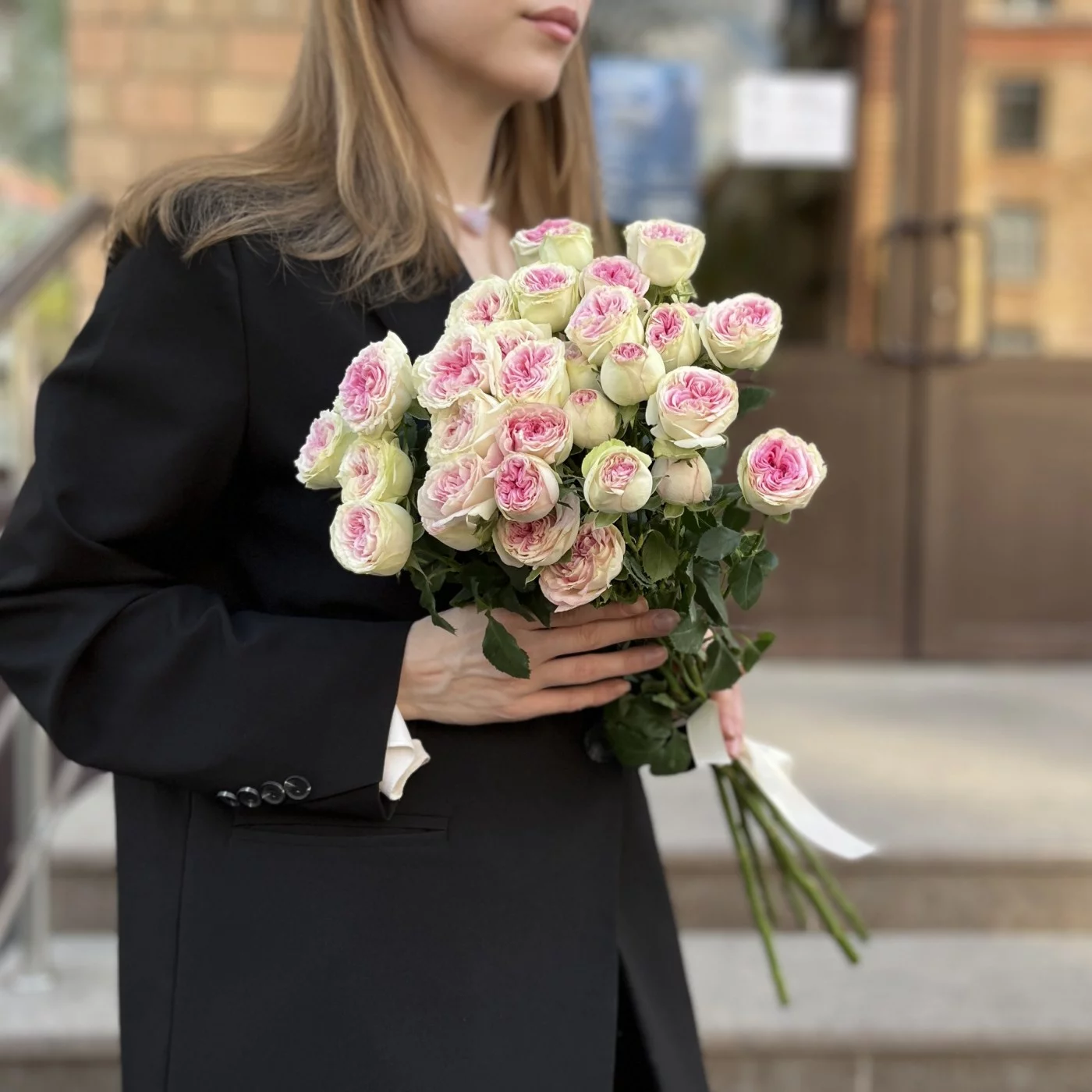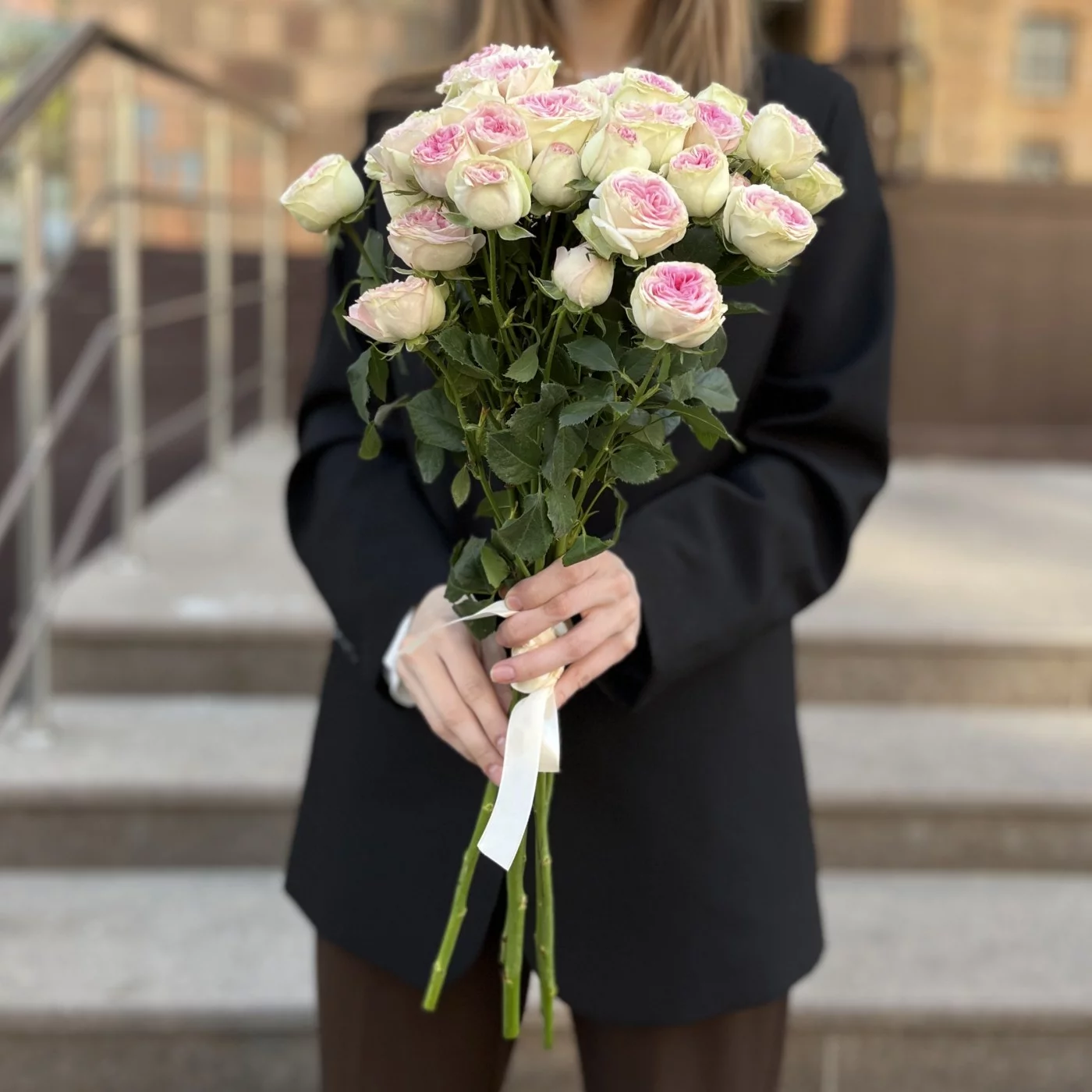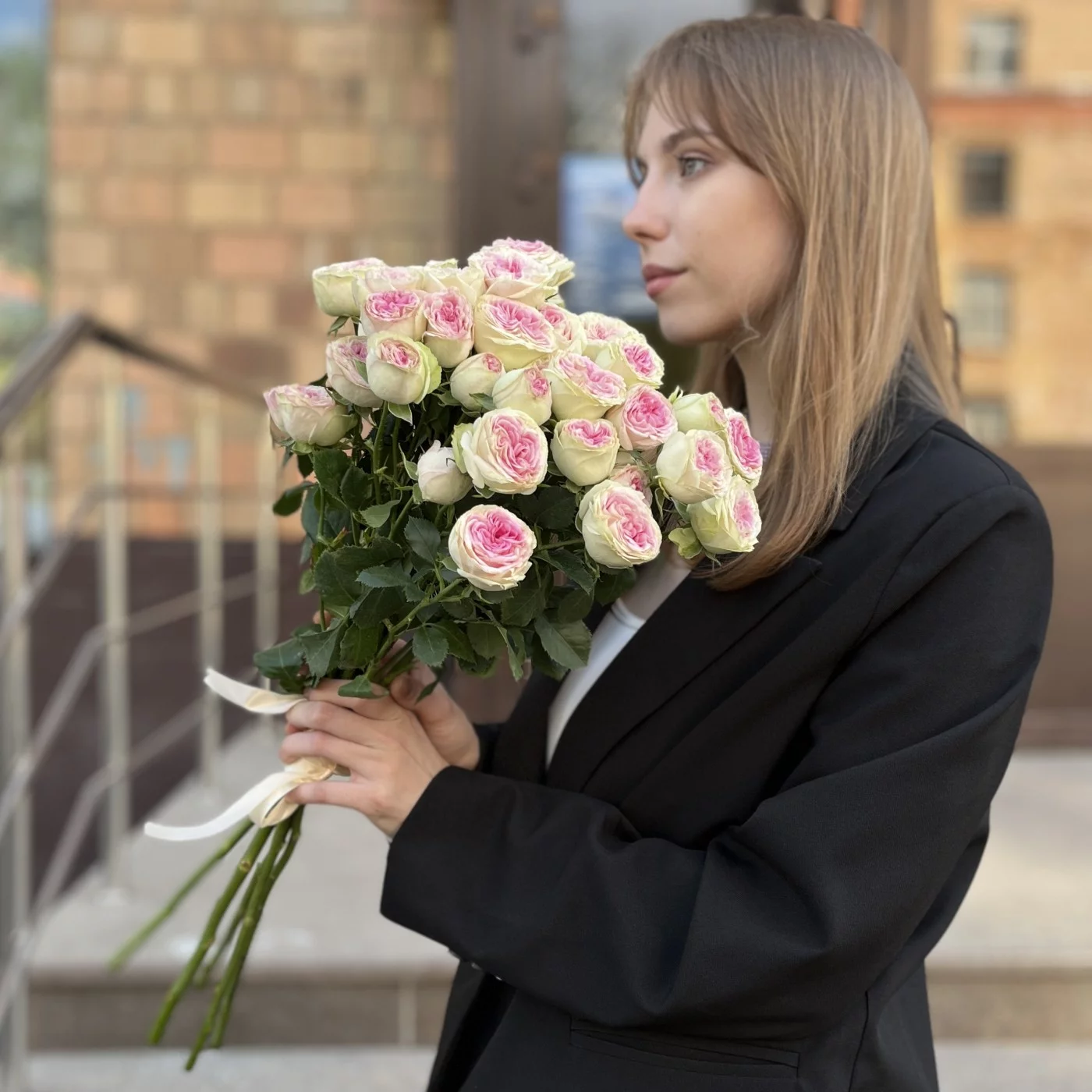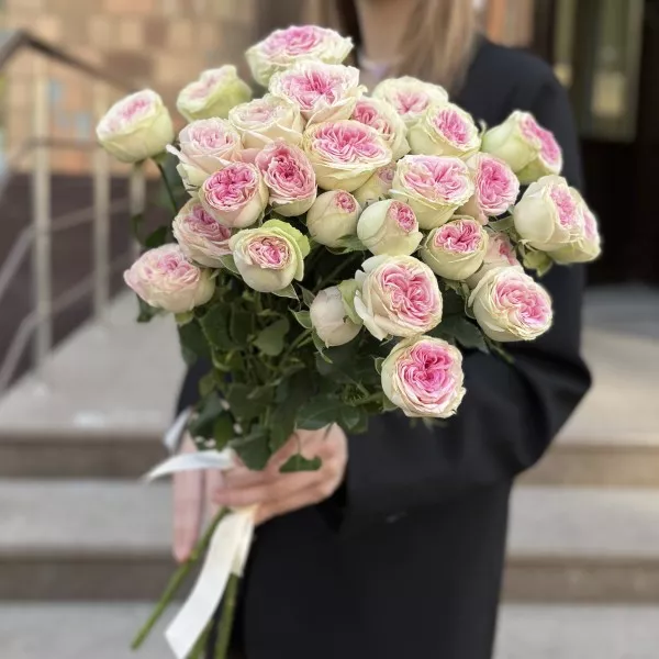 5 кустовые пионовидные розы Джелатто 50 см, восхищают своим нежным и утонченным цветом. Розы имеют мягкие пастельные оттенки, варьирующиеся от кремового до нежно-розового, создавая гармоничную и романтичную композицию. Каждая роза обладает крупными, многослойными бутонами, которые раскрываются в великолепные цветы, излучающие элегантность и нежность.