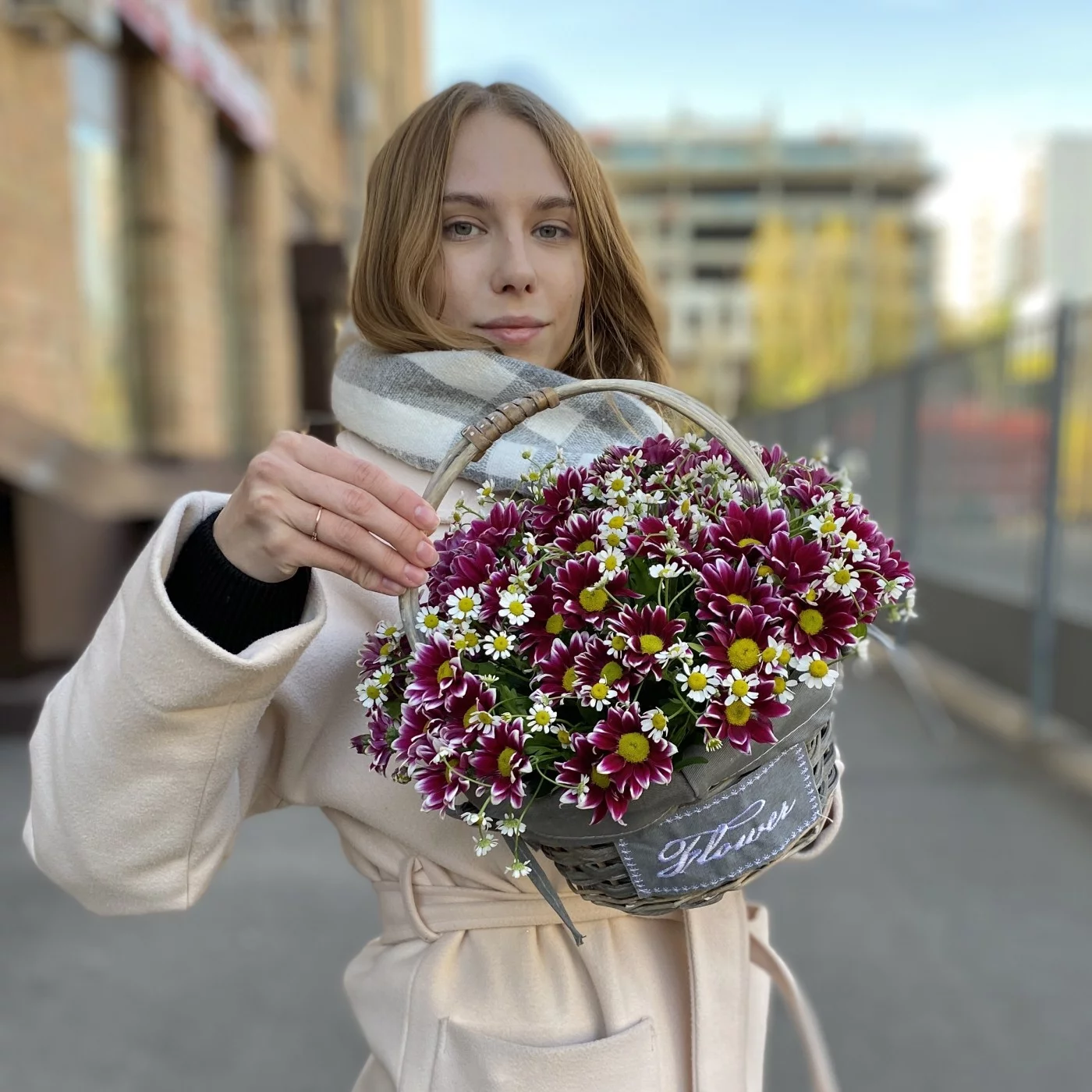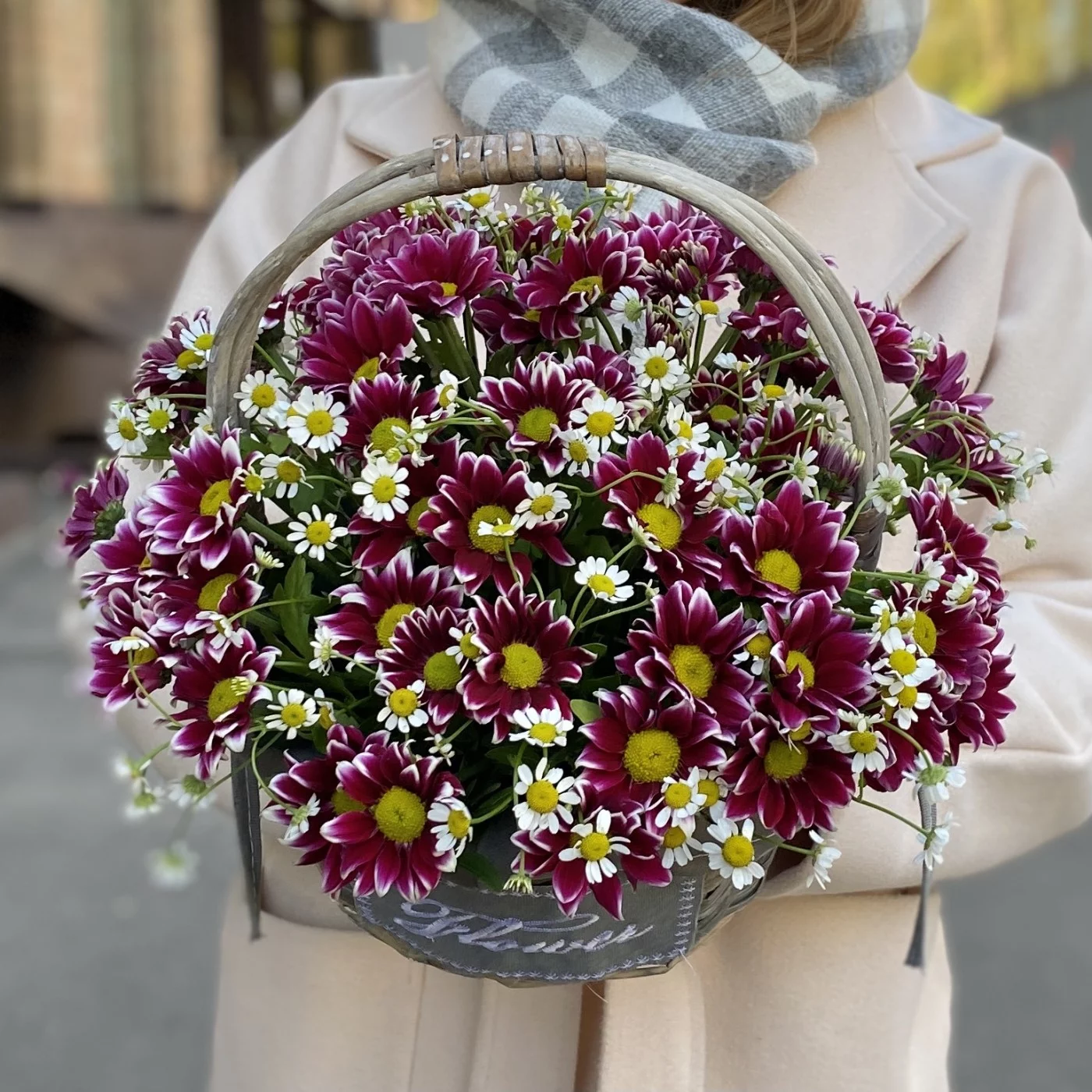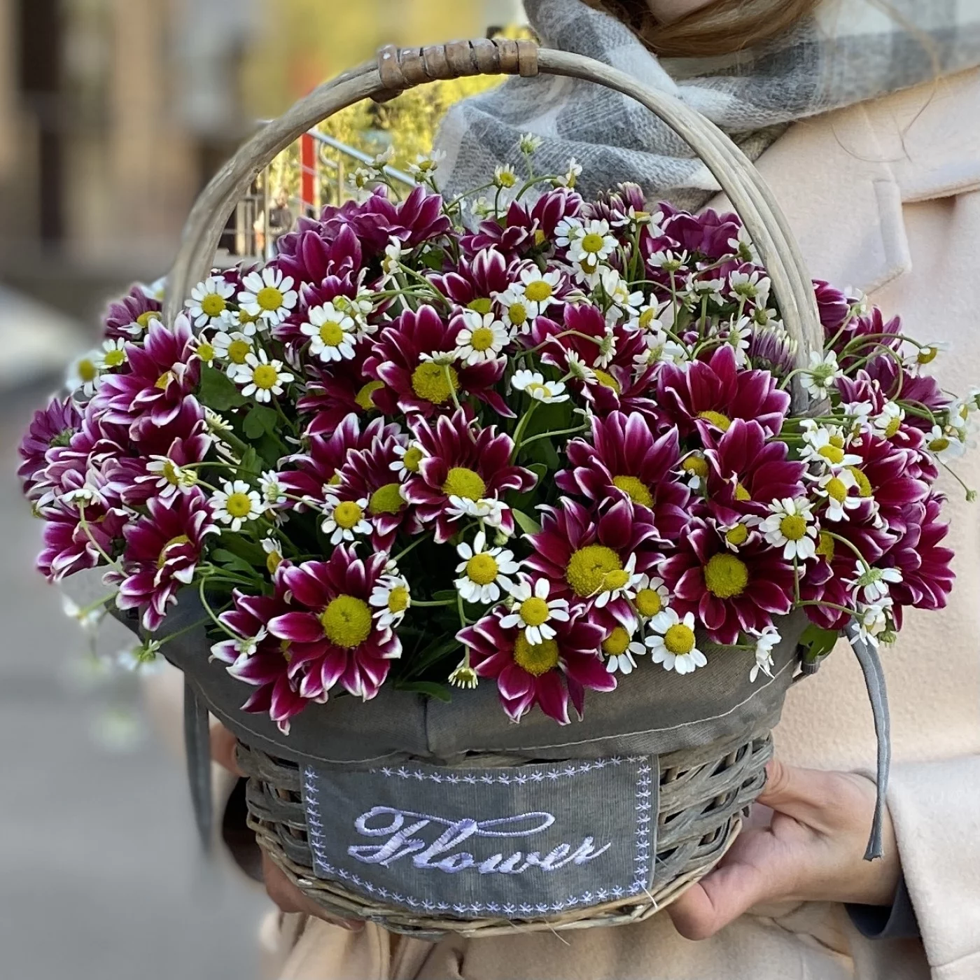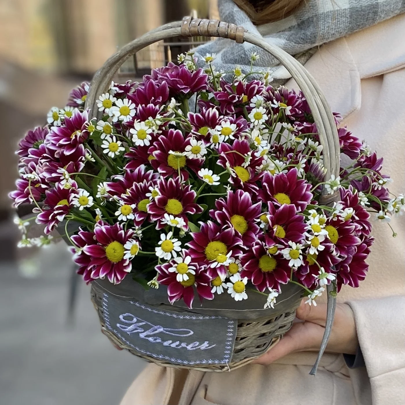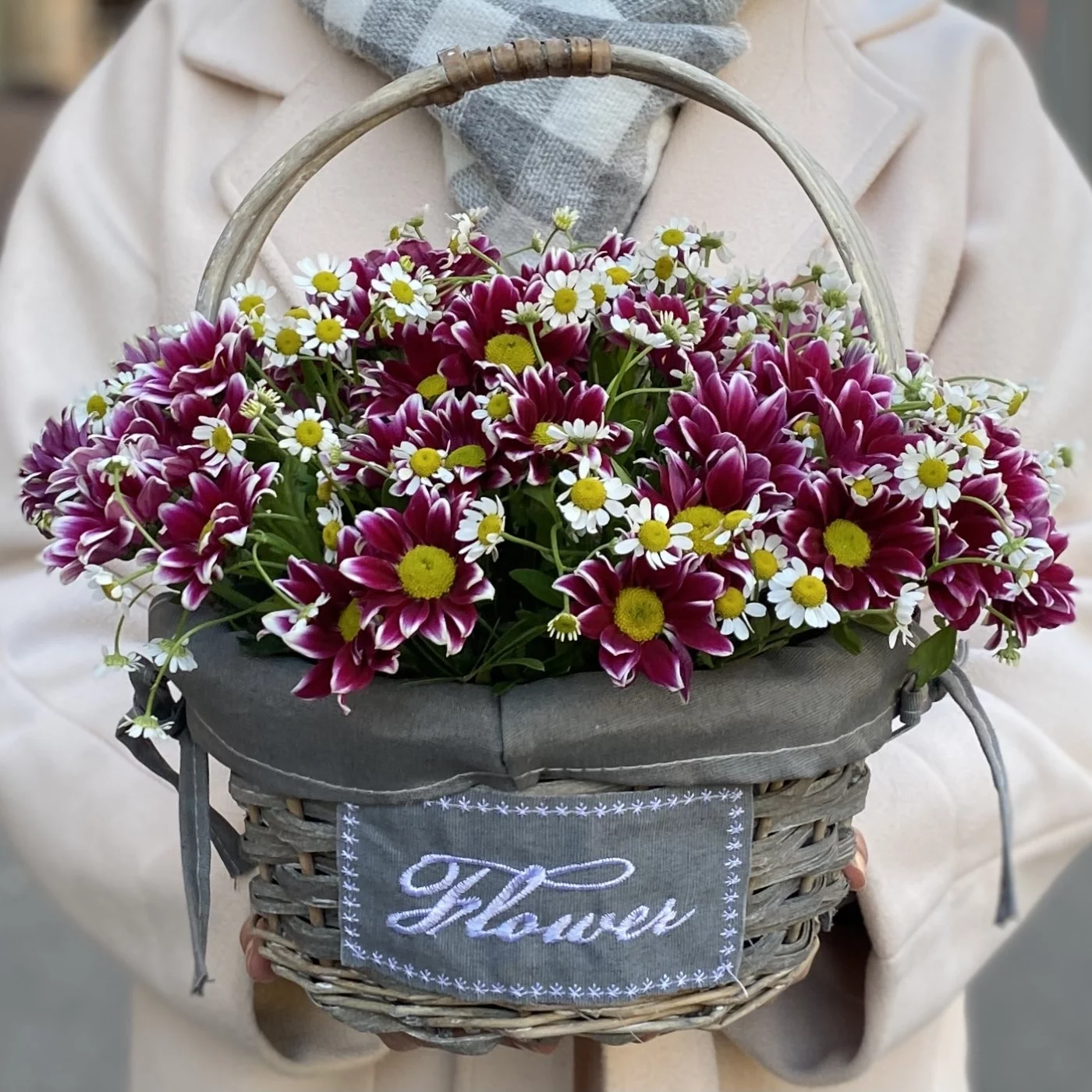 Букет из кустовых хризантем с ромашками в корзине — это отличный выбор для подарка, который подарит радость и позитивные эмоции. Такой яркий и жизнеутверждающий букет украсит любой праздник, собираясь на столе или становясь прекрасным элементом декора!