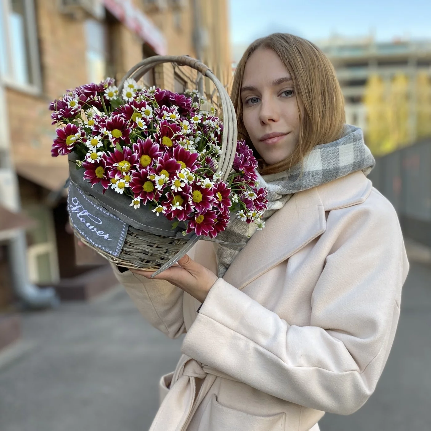 Букет из 5 кустовых хризантем с ромашками в корзине — это замечательное, яркое и жизнерадостное цветочное оформление, которое станет прекрасным подарком для любого повода.