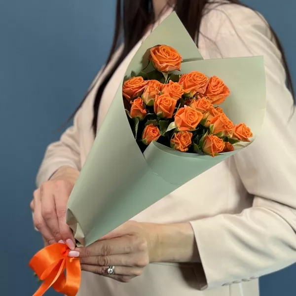Букет из 5 кустовых оранжевых роз Чарминг Бейб высотой 40 см — это яркое и эффектное решение для выражения радости, благодарности или просто чтобы порадовать близкого человека. Такой букет отлично подойдет для небольшого, но выразительного подарка.