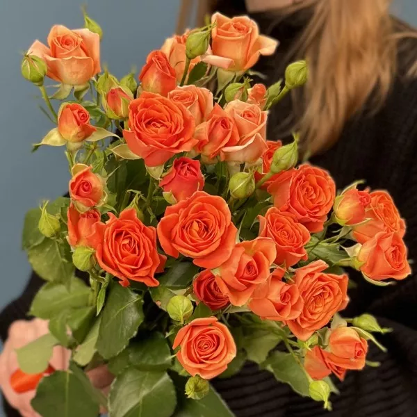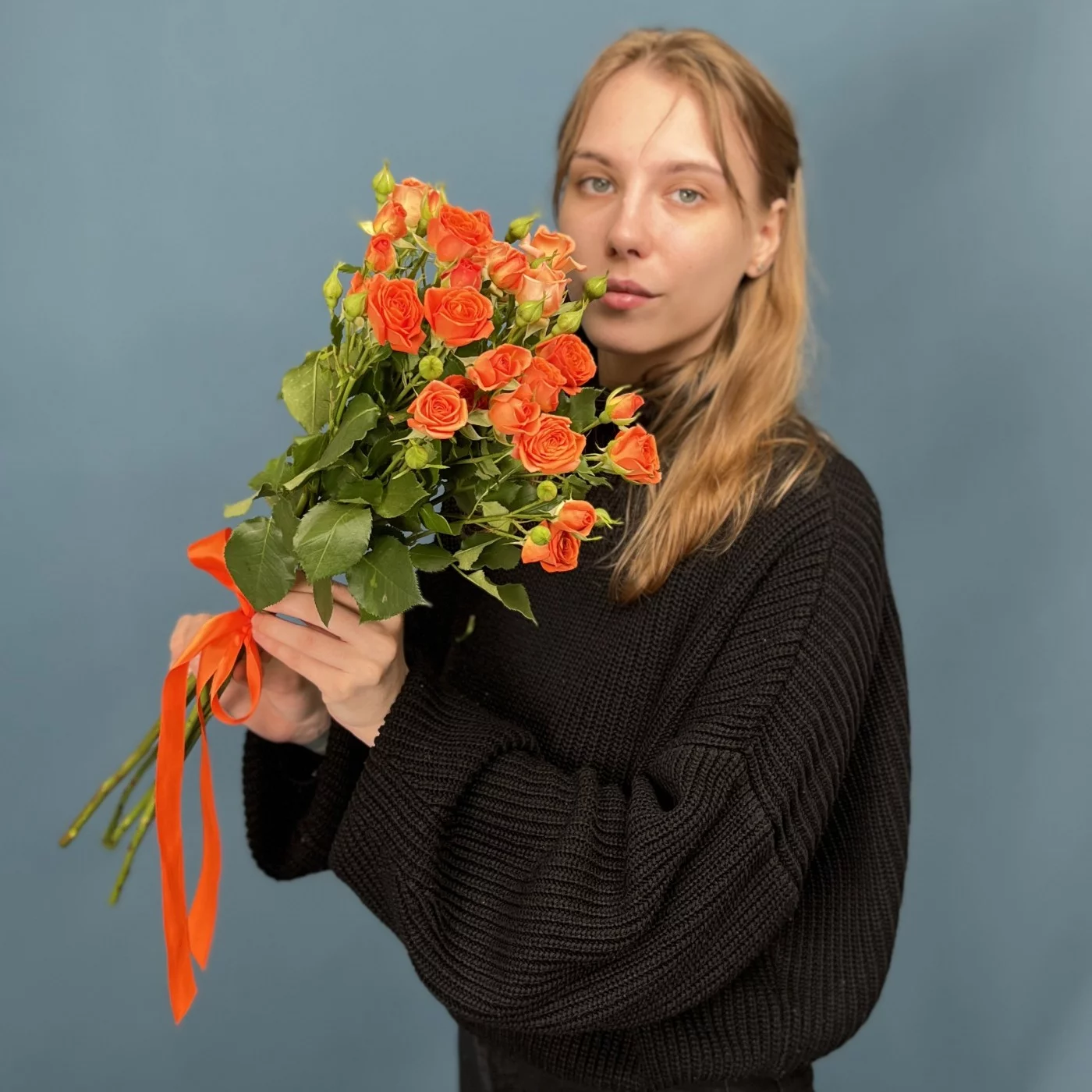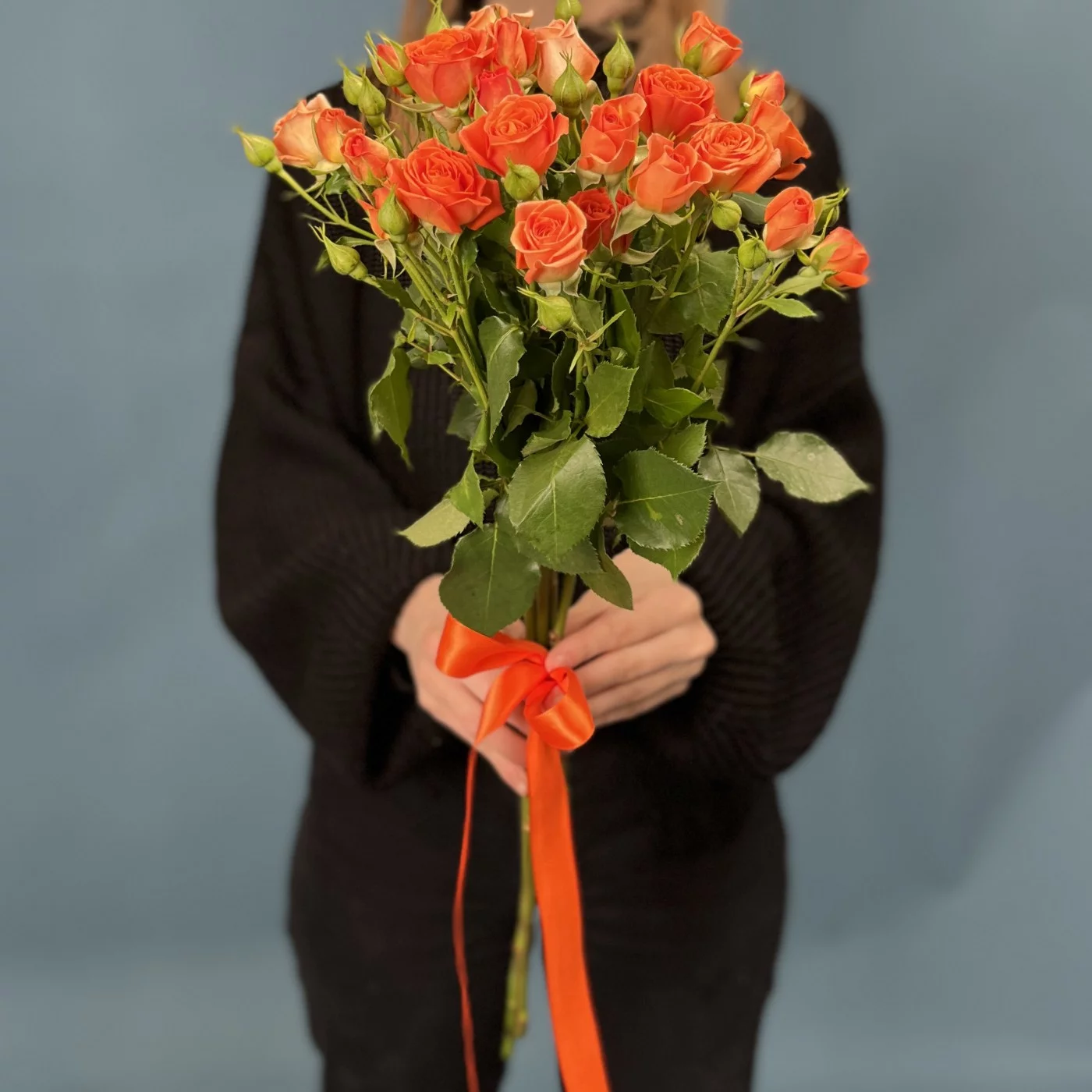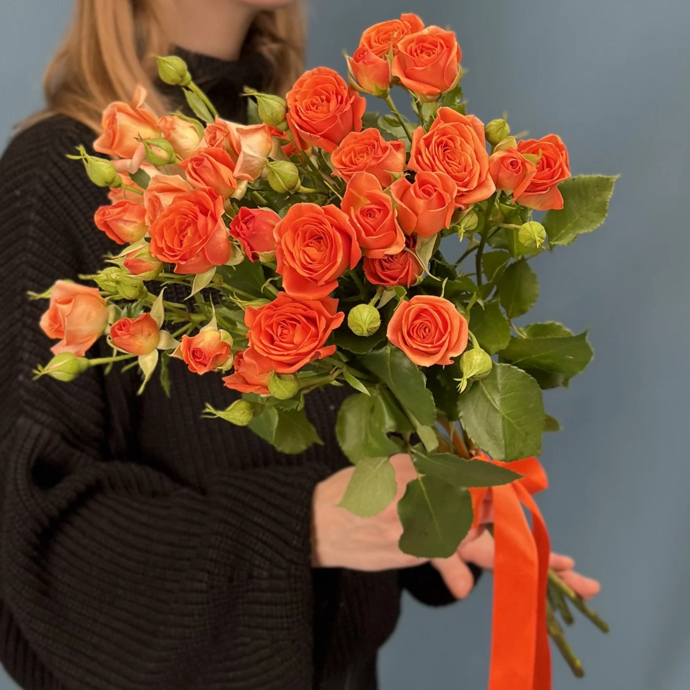 5 кустовых оранжевых роз Чарминг Бейб 50 см — это яркий букет, который прекрасно передаёт тепло, энергию и позитивные эмоции.