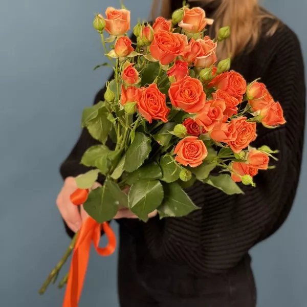 5 кустовых оранжевых роз Чарминг Бейб 60 см — это яркий букет, который прекрасно передаёт тепло, энергию и позитивные эмоции.